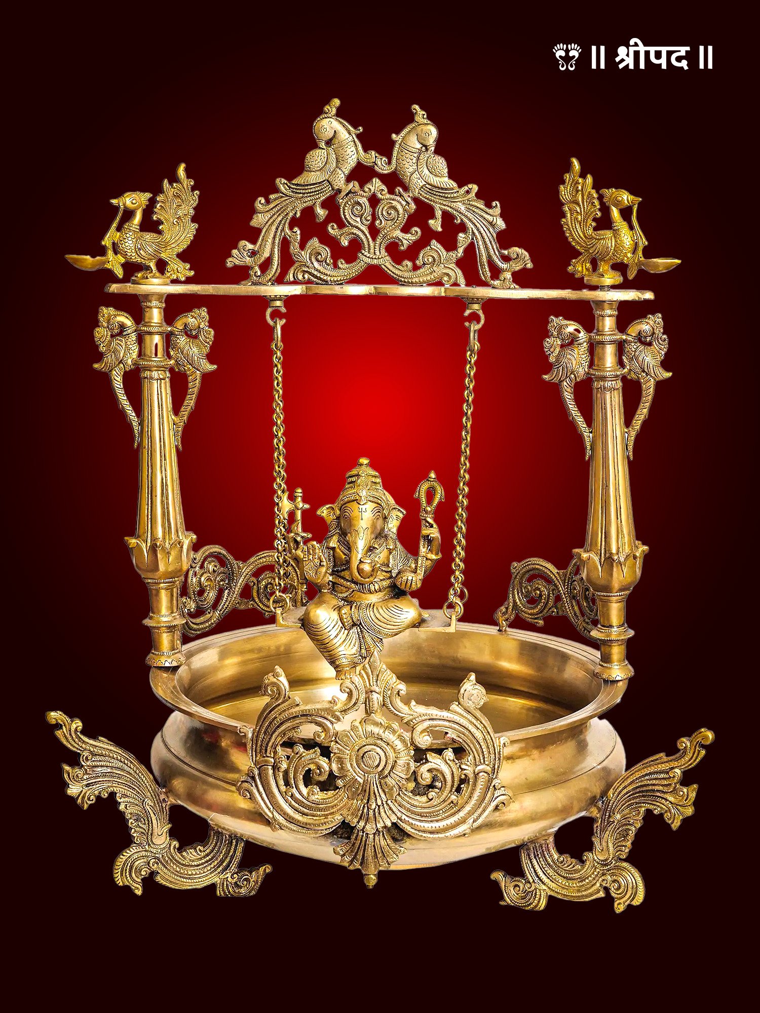 Swinging Lord Ganesha Brass Urli with Miniscule Peacock Lamps | 27-Inch | Brass