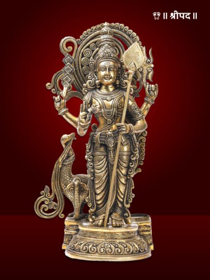 Crafted from high-quality brass, the statue is rich in intricate details, from the finely sculpted ornaments and attire to Lord Karttikeya’s confident yet compassionate expression. Holding his divine spear, the Vel, in one hand, the statue represents protection, righteousness, and the triumph of good over evil.