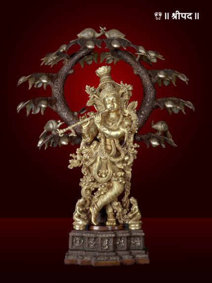The statue is adorned with intricate detailing, from Krishna’s serene expression and finely crafted attire to the delicate jewelry that enhances his divine presence. Standing under a beautifully sculpted tree with lush branches, the scene evokes the serenity of Vrindavan, where Krishna’s lilas (divine plays) unfolded.