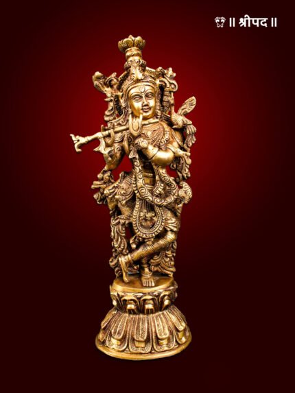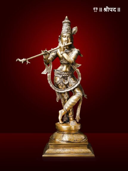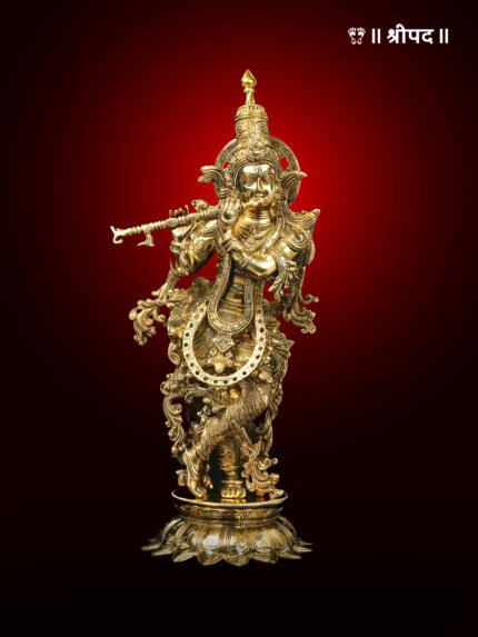 The 25-inch superbly adorned brass statue of Lord Krishna standing gracefully on a lotus pedestal while playing his flute is a magnificent representation of divine charm, love, and musical artistry. Capturing the essence of Krishna in his iconic posture, the statue showcases the Lord’s enchanting presence, his flute resonating with the melodies that captivate the hearts of devotees and the universe alike.