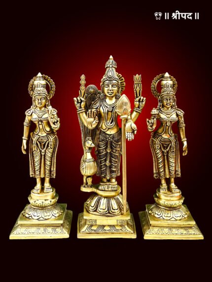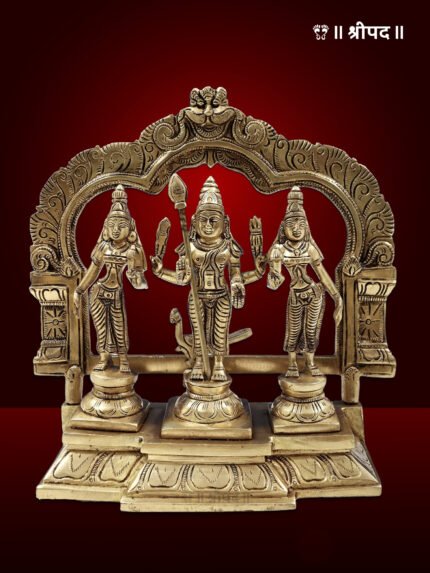 Lord Karttikeya is surrounded by his two beloved consorts, Devasena, the daughter of Indra, and Valli, a tribal princess, representing both celestial and earthly connections. Their presence highlights the balance between divine and human realms. The finely detailed brass craftsmanship captures the intricate jewelry, flowing garments, and serene expressions of all three figures, bringing the divine trio to life with exceptional artistry.