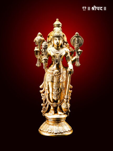 Handcrafted in India by skilled artisans, this brass statue showcases intricate detailing, from the finely adorned crown and ornaments to the serene yet commanding expression of the deity. The idol’s majestic stance, complete with the sacred shankha (conch) and chakra (discus), reflects spiritual grandeur and meticulous artistry.
