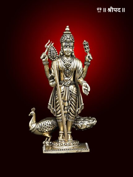 Each arm holds a symbolic weapon – the vel (spear) for victory and protection, while the other hands are poised in blessings and reassurance. The intricate detailing of Lord Murugan’s attire, ornaments, and serene expression showcases exceptional craftsmanship. The beautifully sculpted peacock at his side adds charm and significance, symbolizing purity and transcendence.