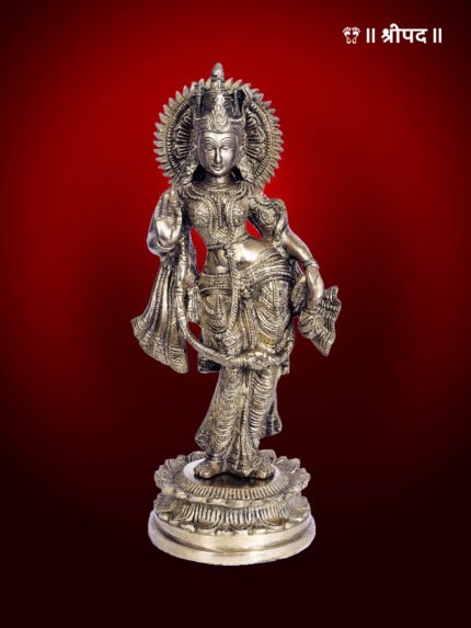Fashioned from high-quality brass, the sculpture showcases Radha Rani in a serene pose, her elegant features and intricate ornaments reflecting the pinnacle of traditional craftsmanship. The flowing contours of her attire and the intricate detailing on her jewelry highlight the devotion of skilled Indian artisans.