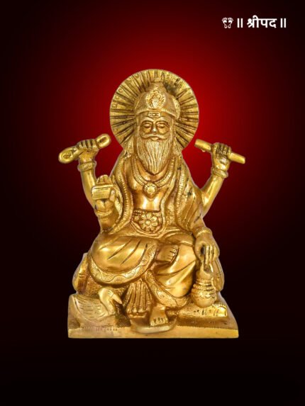 Crafted from high-quality brass, the statue features exquisite detailing in the deity's crown, attire, and tools, reflecting the brilliance of traditional craftsmanship. The divine aura of Lord Vishwakarma is captured in the serene expression on his face, embodying creativity, innovation, and divine wisdom.