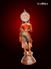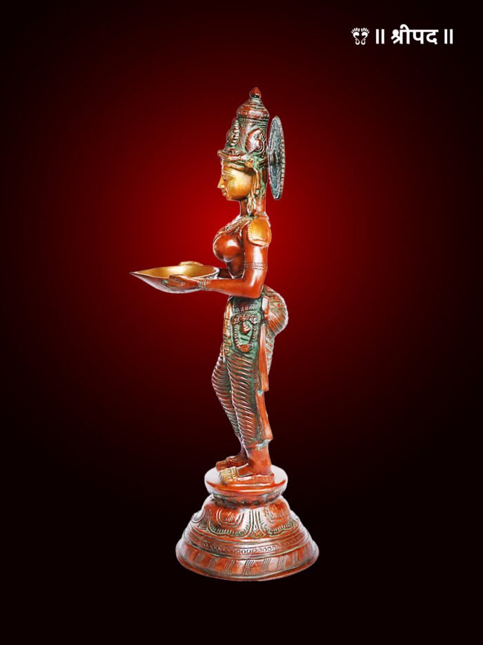 Crafted from high-quality brass with an antique finish, the figurine radiates a vintage charm that adds depth and character to any space. The diya held by the lady is functional, making it perfect for lighting during rituals, festivals, or as a decorative element that brings warmth and light to the surroundings.