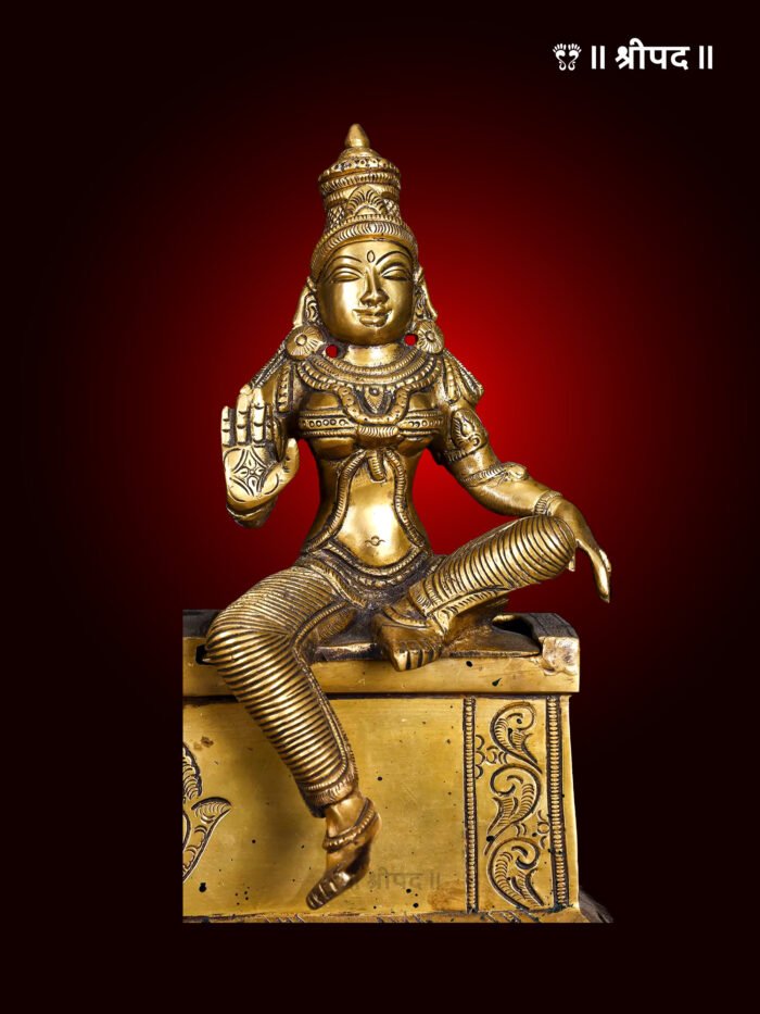 The intricate detailing on the statue, from the finely sculpted jewelry to the flowing robes, showcases exceptional craftsmanship. The brass finish with its antique polish adds a timeless charm to the piece.