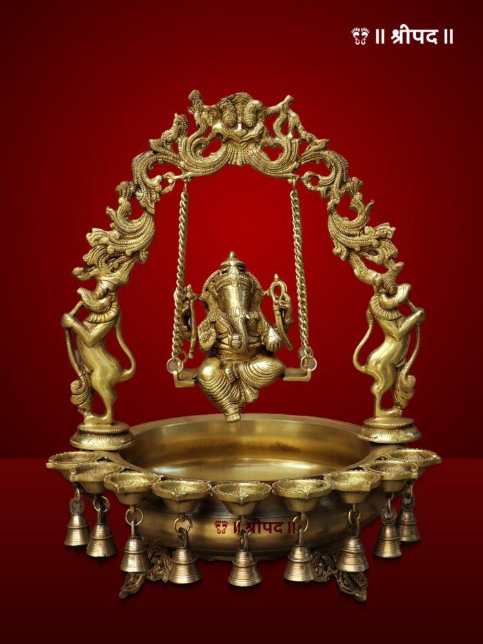 Swinging Lord Ganesha Brass Urli with Miniscule Peacock Lamps | 27-Inch | Brass