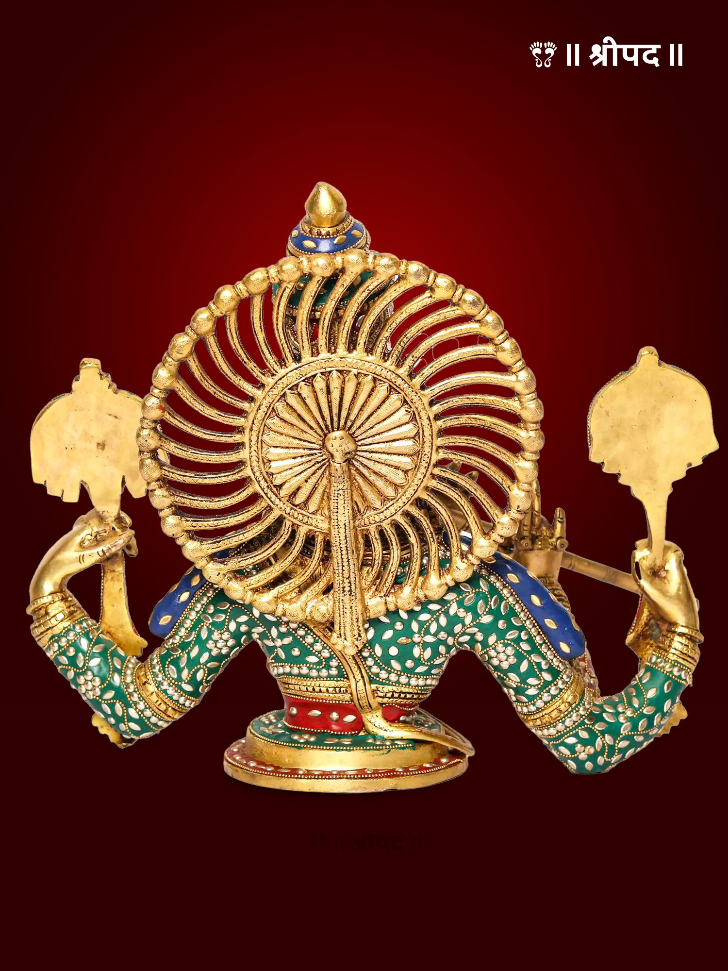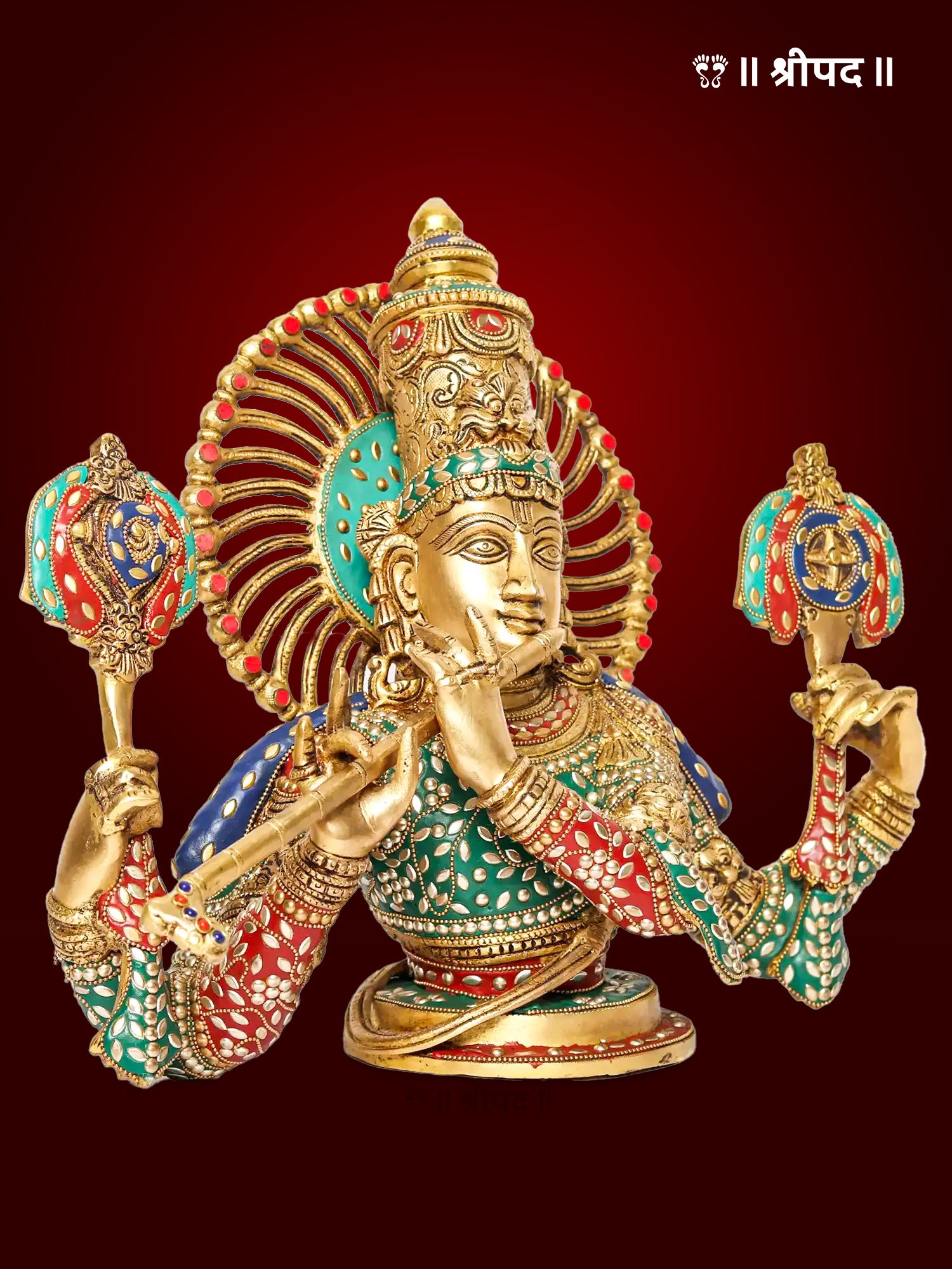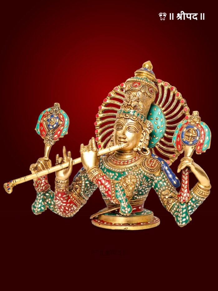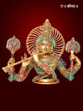 The 15″ Chaturbhuja Venugopal (Krishna) Bust Brass Statue is a stunning and intricately crafted representation of Lord Krishna, the beloved divine figure of the Bhagavad Gita. Made from high-quality brass, this statue captures the essence of Lord Krishna in his Chaturbhuja (four-armed) form, exuding divine power and grace. The bust features Lord Krishna holding his signature flute, symbolising his role as the enchanting flute player who captivates the hearts of all living beings.