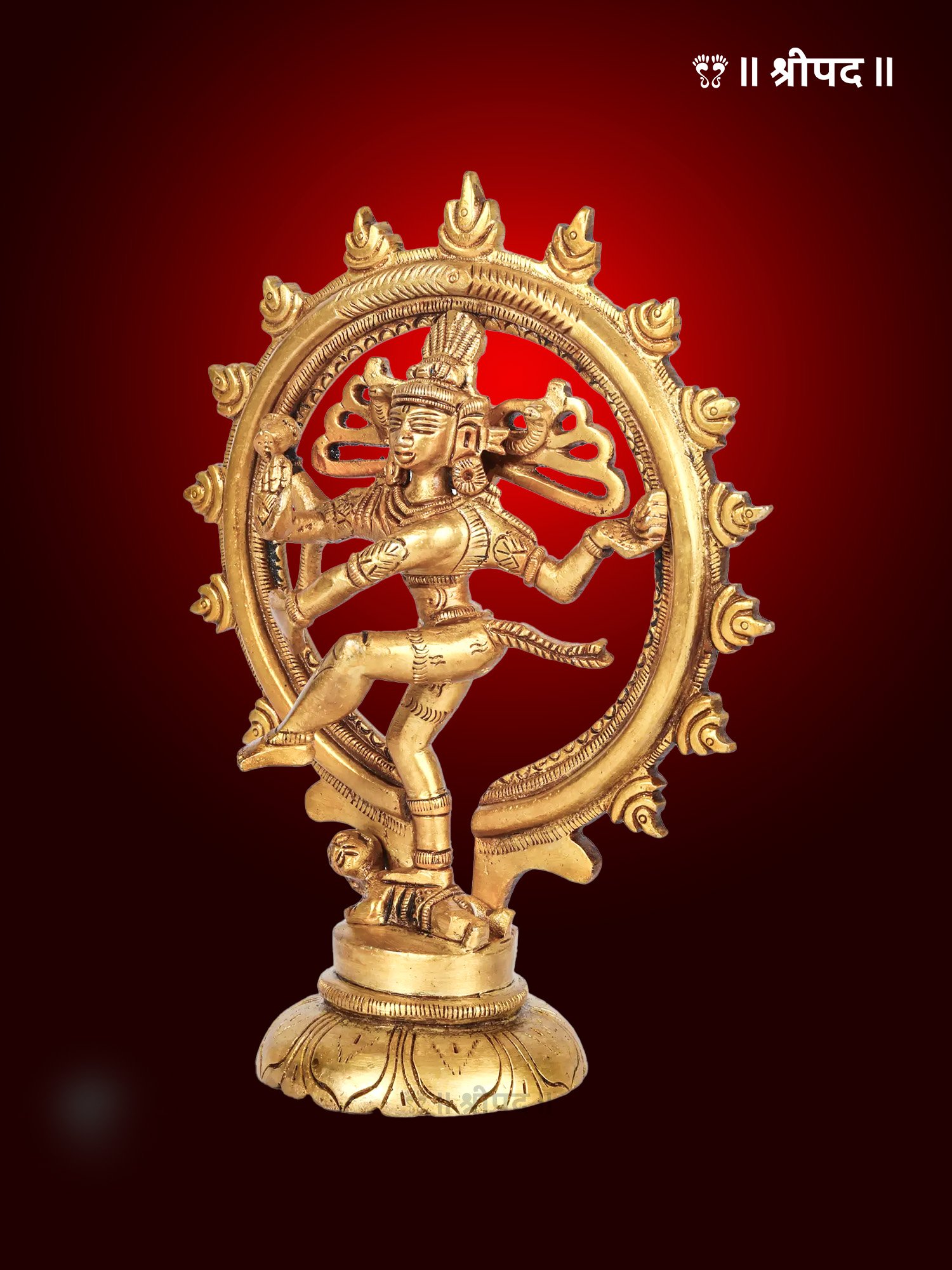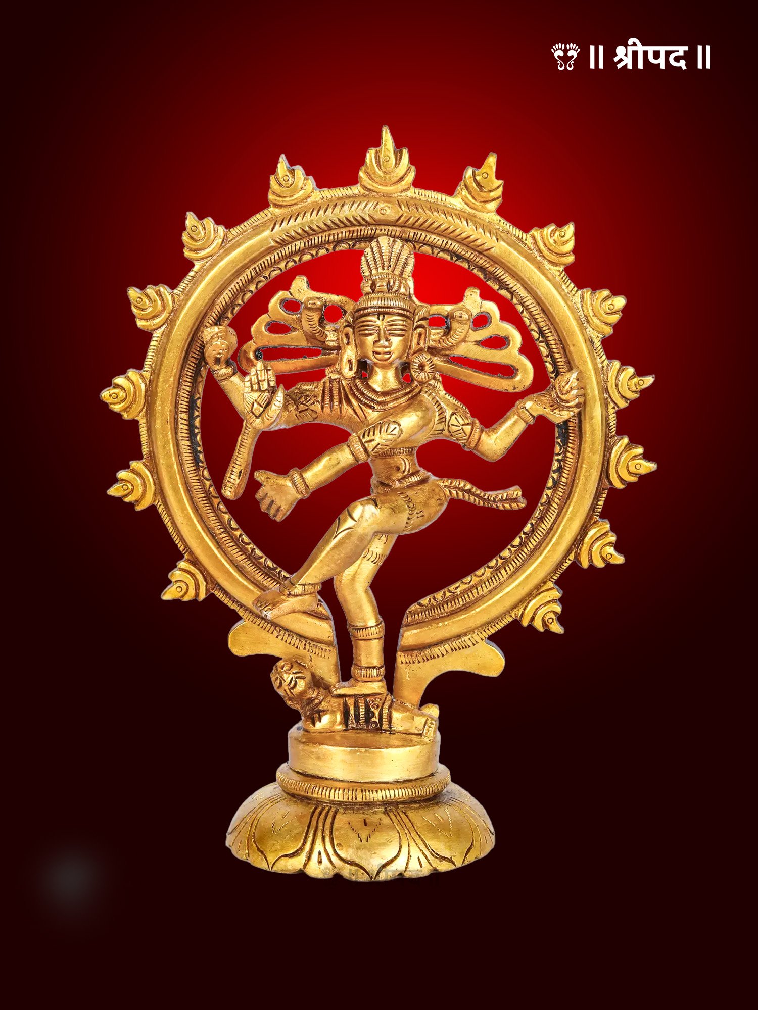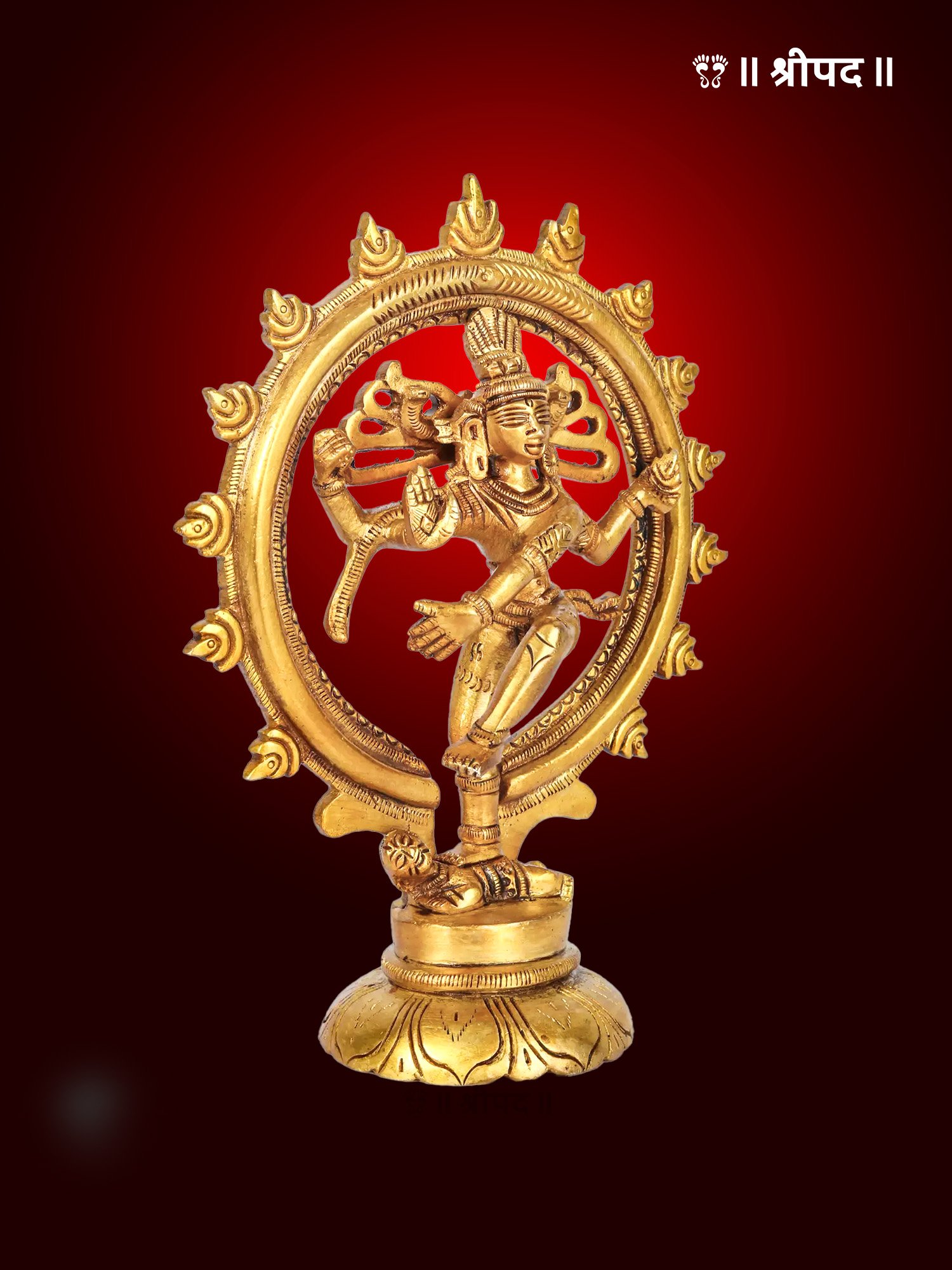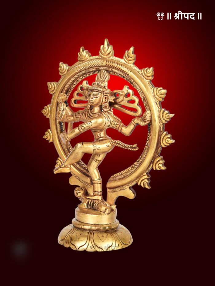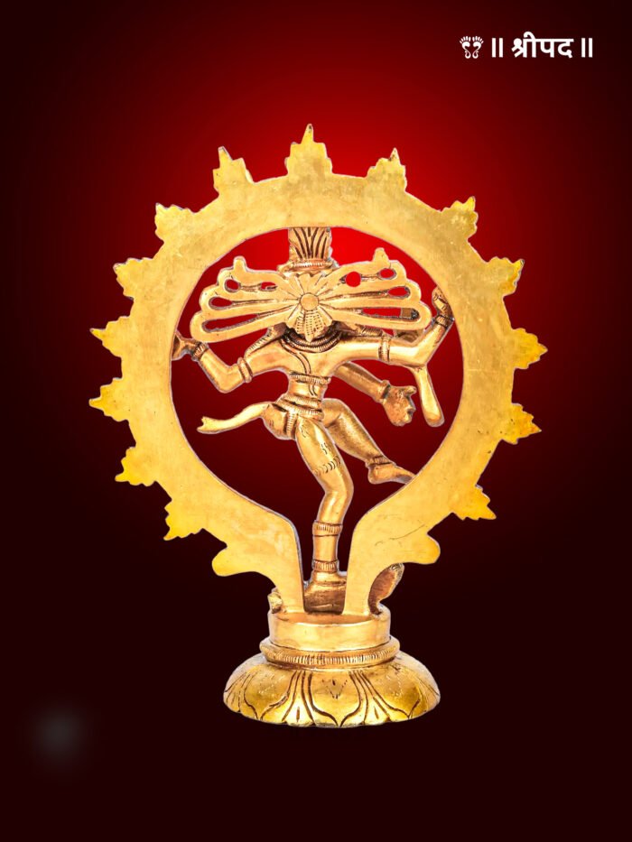 Crafted with exquisite precision, the brass statue captures the intricate details of Lord Shiva’s form, from his flowing hair, adorned with the crescent moon, to his third eye and multiple arms holding symbolic items like the damru (drum) and fire. The circular halo around him represents the cosmic wheel of time.