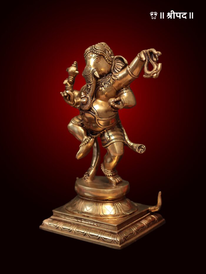 Crafted from premium-quality brass, the statue radiates a rich golden hue, adding a sense of grandeur and timeless appeal. The intricate detailing of Ganesha’s adorned crown, jewelry, and flowing attire reflects the finesse of skilled artisans, while the dynamic dance pose showcases his joyous yet powerful form.