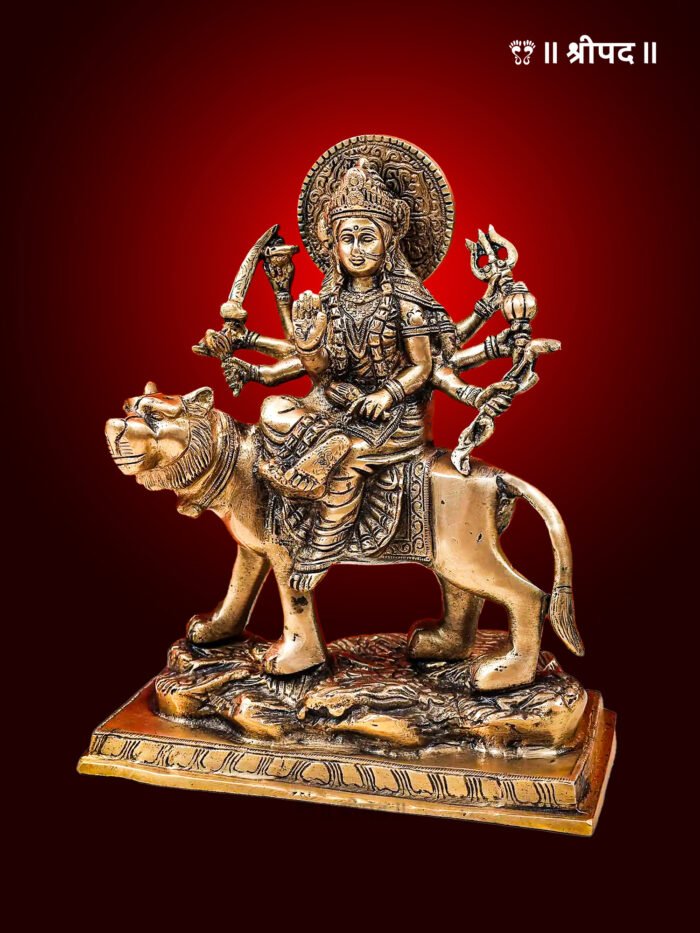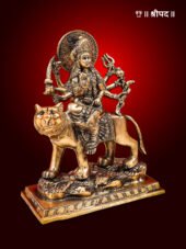 Crafted from high-quality brass, the sculpture showcases exquisite detailing, from Durga’s intricate crown and ornaments to the lion beneath her. The finely sculpted face and posture reflect both grace and fearlessness, evoking reverence and devotion.