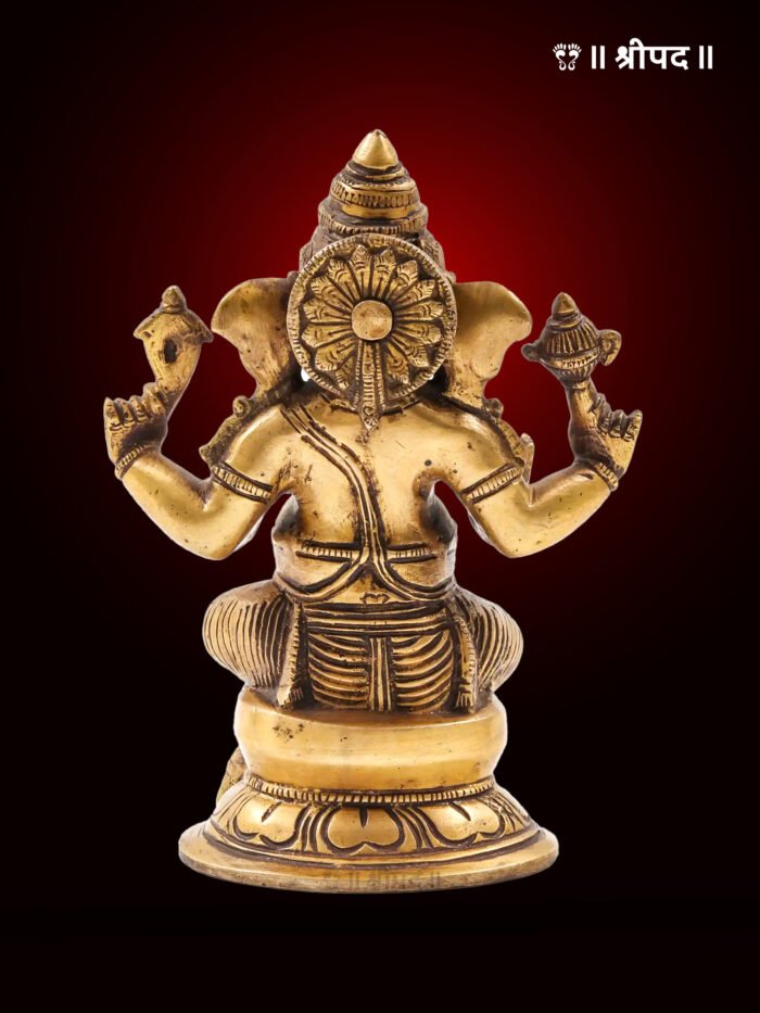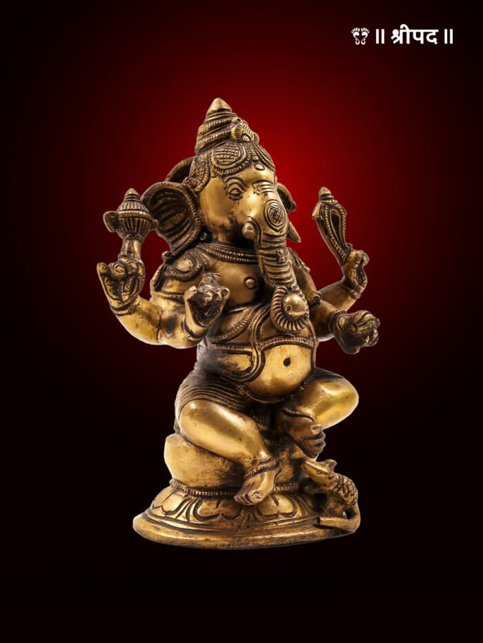 The 8-inch brass statue of Four-Handed Seated Ganesha, also known as Gajanana, is a divine representation of Lord Ganesha, the remover of obstacles and the harbinger of prosperity and wisdom. Seated in a calm and composed posture, Ganesha holds various symbolic objects in his four hands, such as a modak (sweet) representing the rewards of life, a lotus symbolizing purity, an axe for cutting through attachments, and a broken tusk, which signifies self-sacrifice and perseverance.
