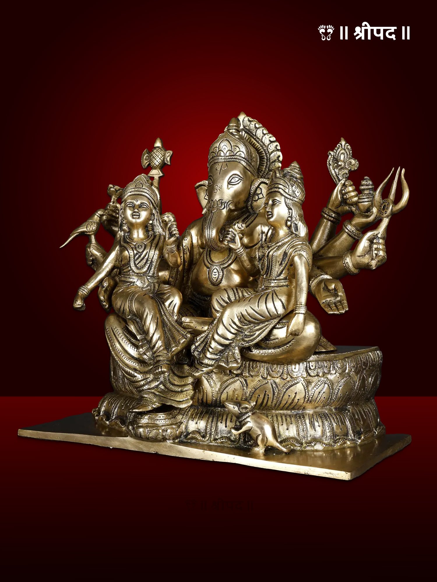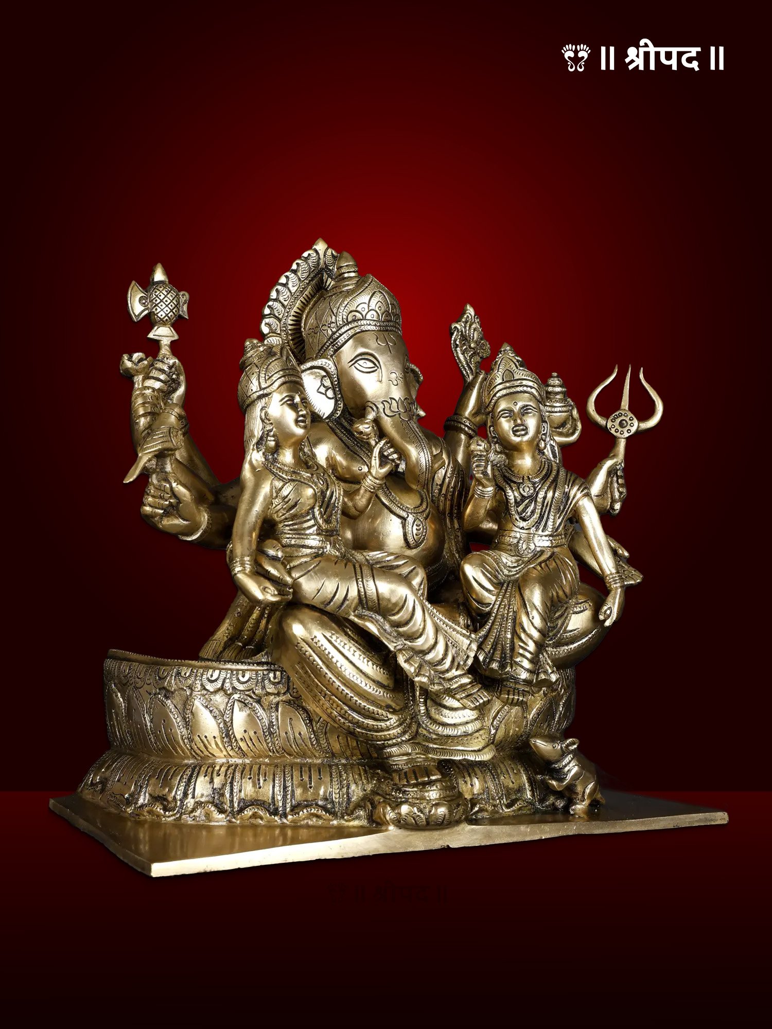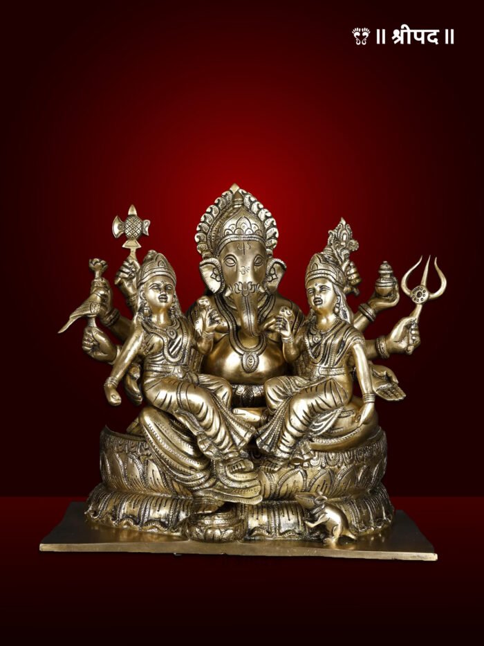 Ganesha with Riddhi Siddhi Seated on Lotus Flower | 13-Inch | Brass