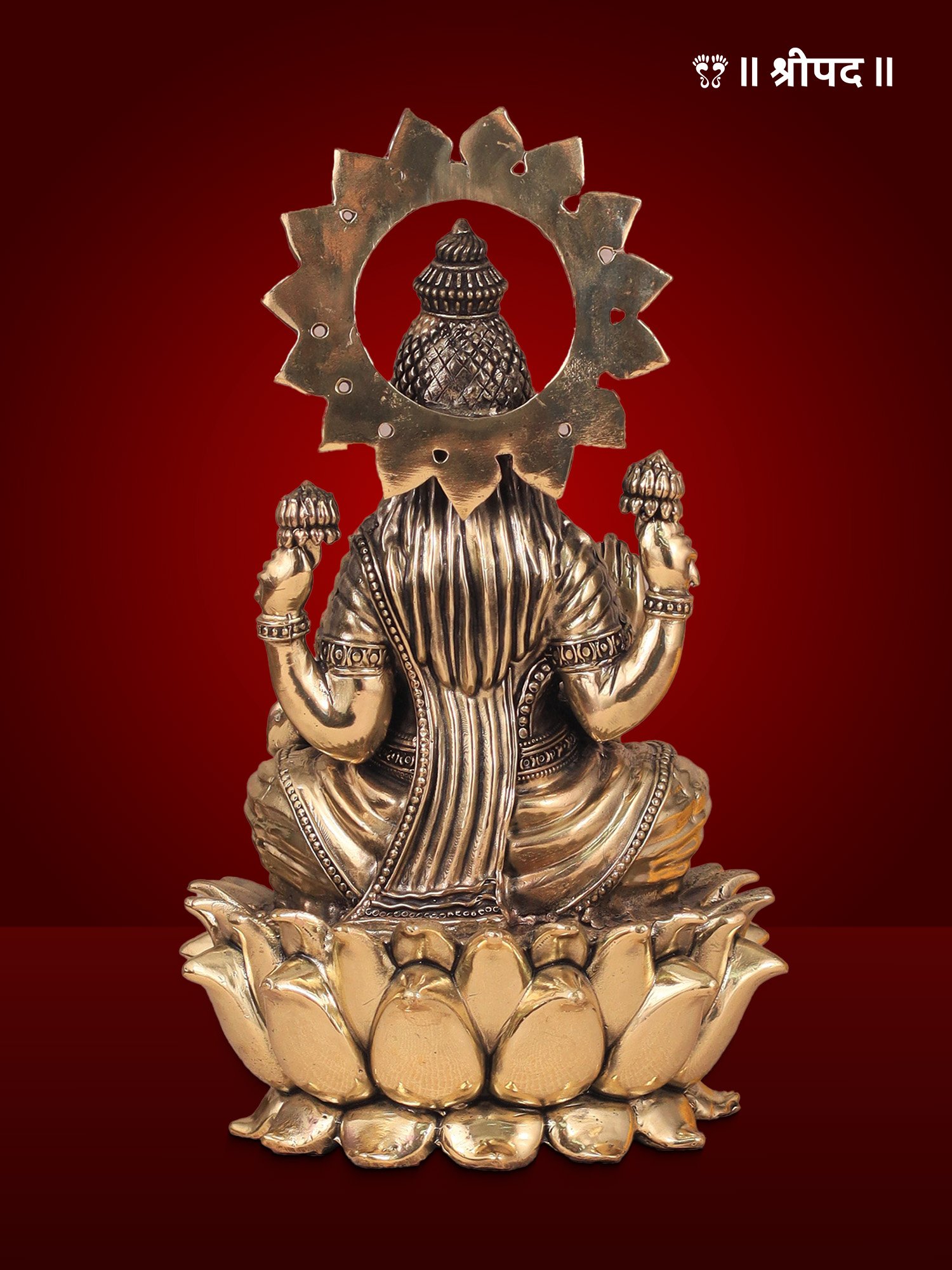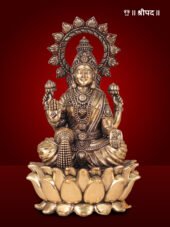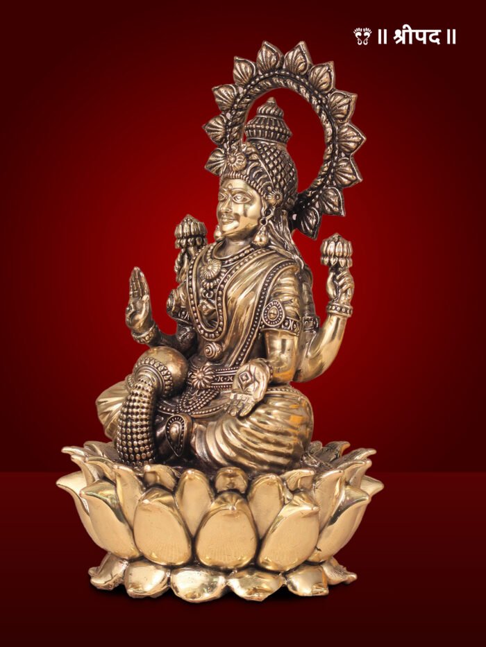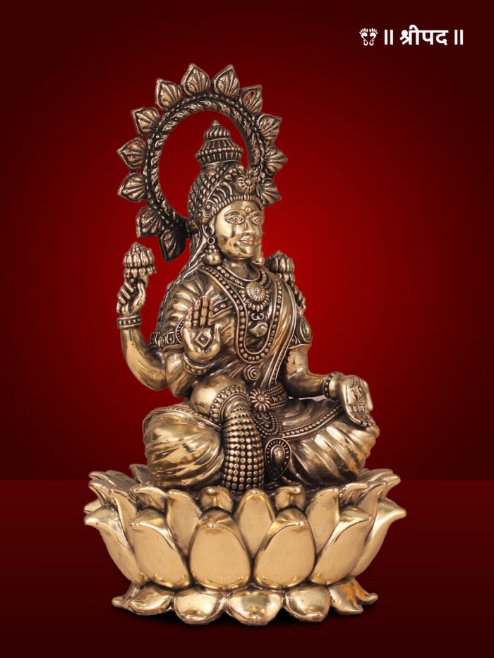 The polished brass finish enhances its timeless appeal, making it an ideal addition to home temples, offices, or as a centerpiece in your living space. Perfect for gifting during Diwali, weddings, or housewarmings, this Lakshmi idol invites positivity, harmony, and divine blessings into any environment.
