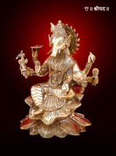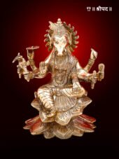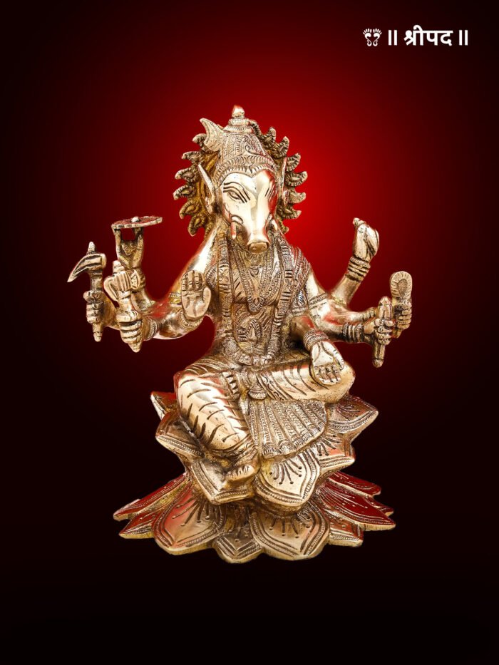 Crafted with exceptional attention to detail, the brass sculpture captures the essence of Goddess Varahi’s divine form, with intricate carvings on her crown, jewelry, and flowing attire. The boar face, often associated with her fierce and determined qualities, is skillfully sculpted, making this piece a unique addition to any collection of religious artifacts.