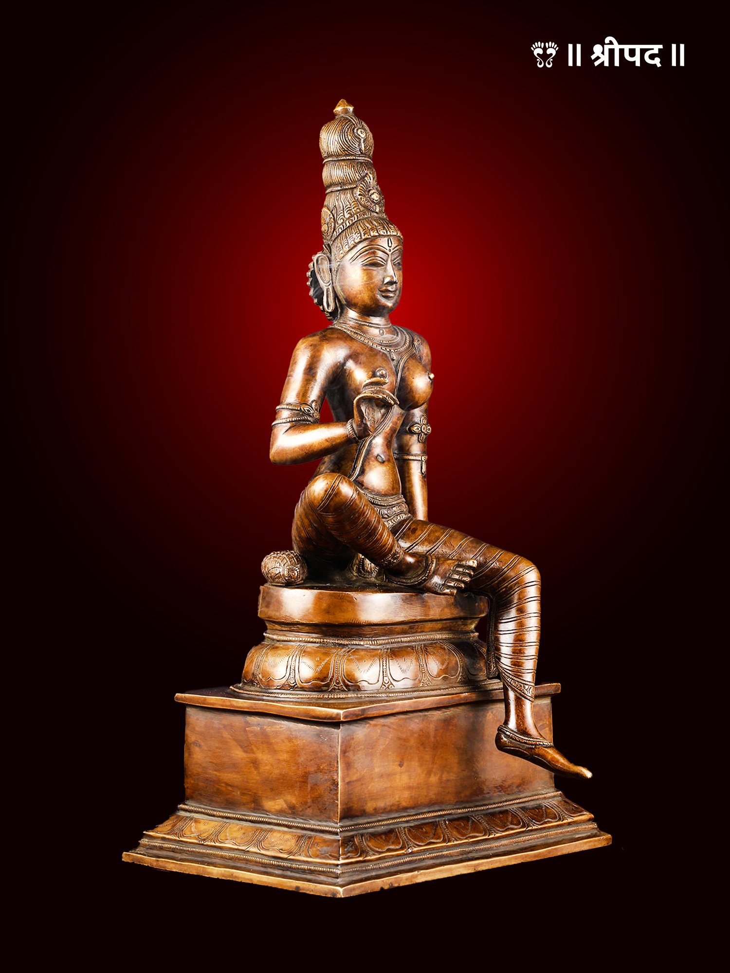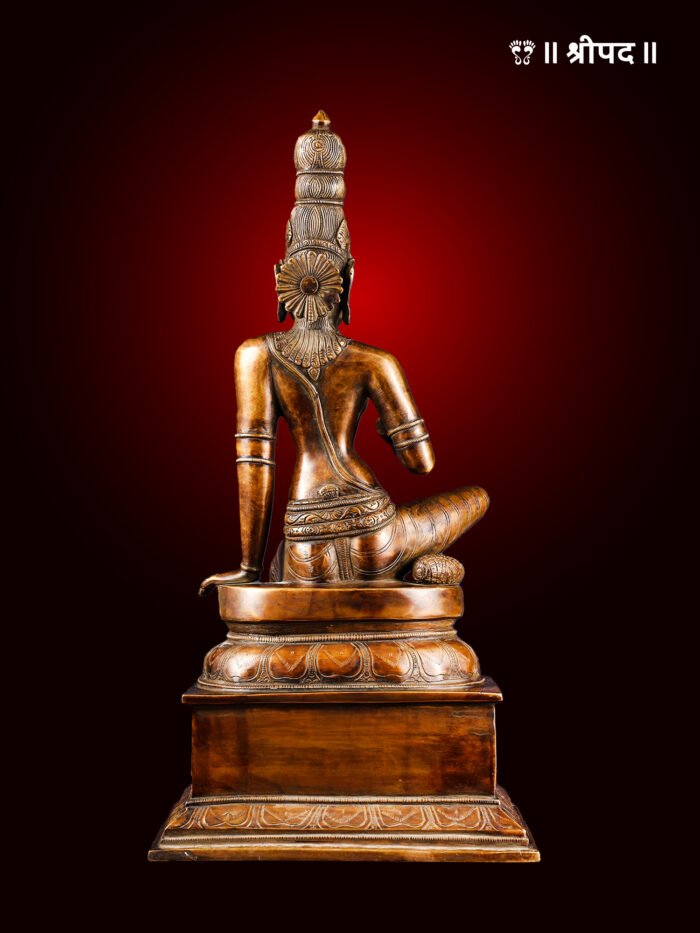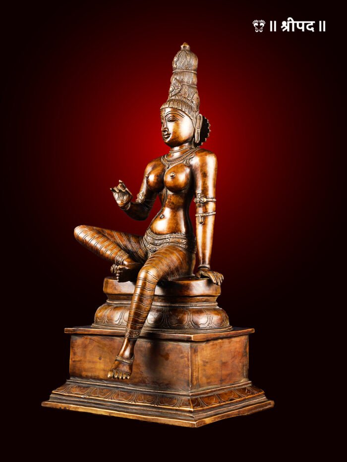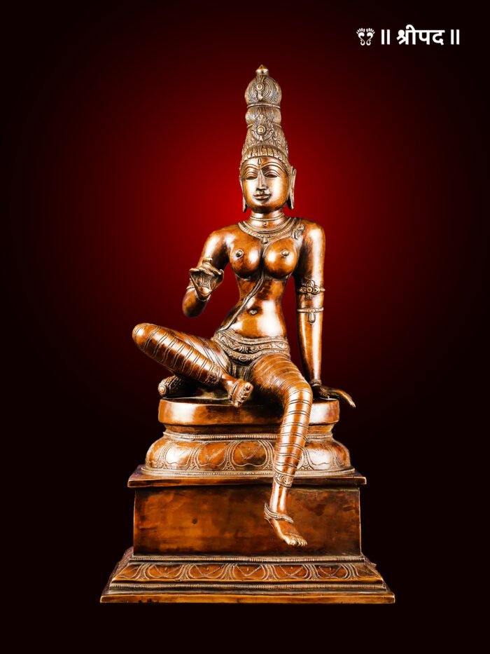 The resplendent Graceful Seated Goddess Parvati (Uma Devi) idol, crafted in solid brass, embodies the divine essence of Shakti. This exquisite 20-inch murti captures Devi Parvati in a serene seated posture, radiating karuṇā (compassion) and śakti (divine energy). Every intricate carving on this masterpiece reflects the auspicious aura of the Divine Mother, the consort of Lord Shiva, and the nurturer of the cosmos.