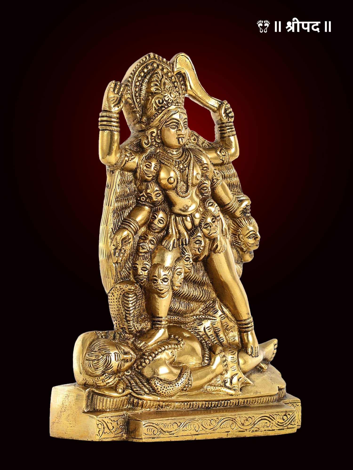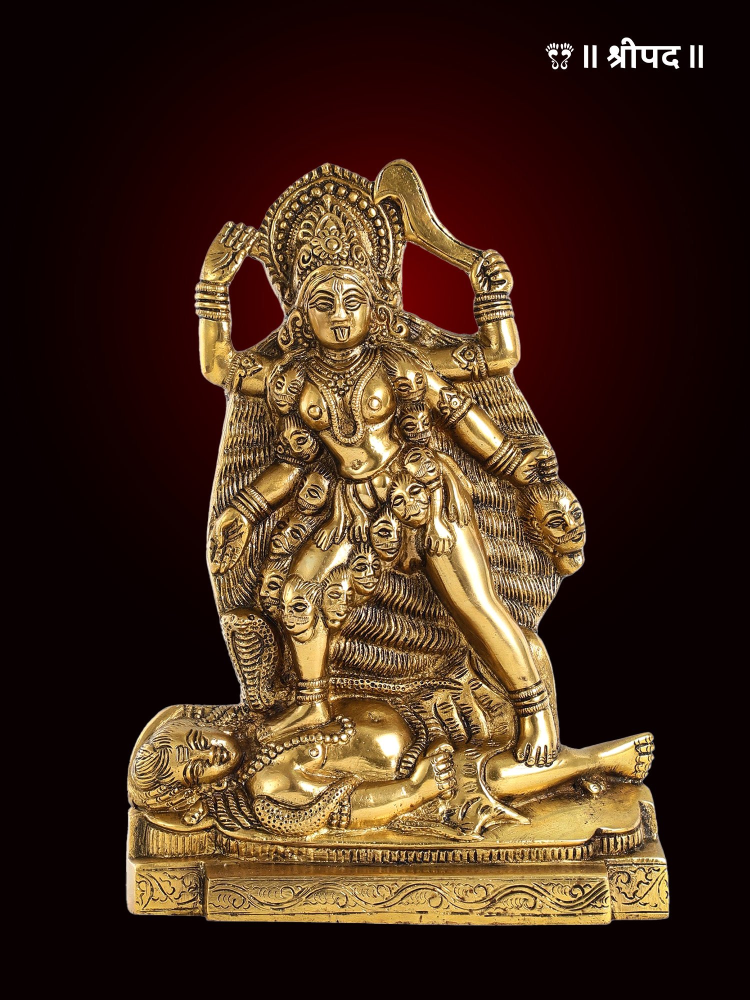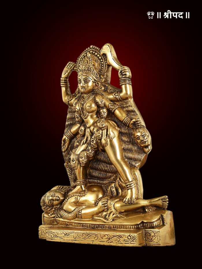 In this idol, Kaali’s gaze is directed towards Lord Shiva, symbolizing the fierce dynamic between creation and destruction, life and death. The intricate detailing, from her multiple arms holding symbolic weapons to the fine carvings on her attire, highlights the exceptional craftsmanship of the artisan. The brass finish adds a radiant, timeless touch to the idol, making it not only a spiritual emblem but also a work of art. This piece is perfect for devotees seeking Kaali’s protection and power in their homes or sacred spaces.