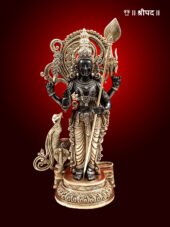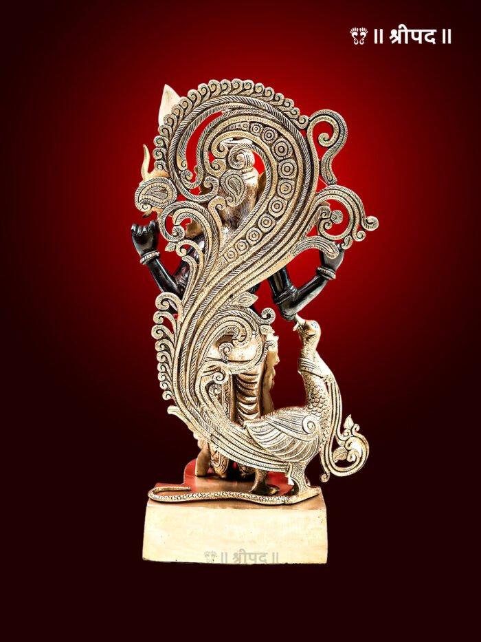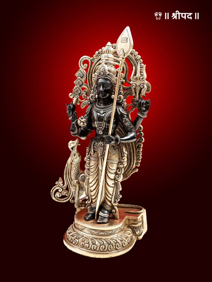 The 20-inch handmade brass statue of Lord Karttikeya, also known as Murugan, is a majestic and spiritually uplifting depiction of the warrior god. Lord Karttikeya, the son of Lord Shiva and Goddess Parvati, is revered as the commander of the celestial army and the embodiment of courage, wisdom, and divine protection. In this statue, he is portrayed standing gracefully, holding his sacred spear, the vel, symbolizing his victory over evil forces and his commitment to upholding righteousness.