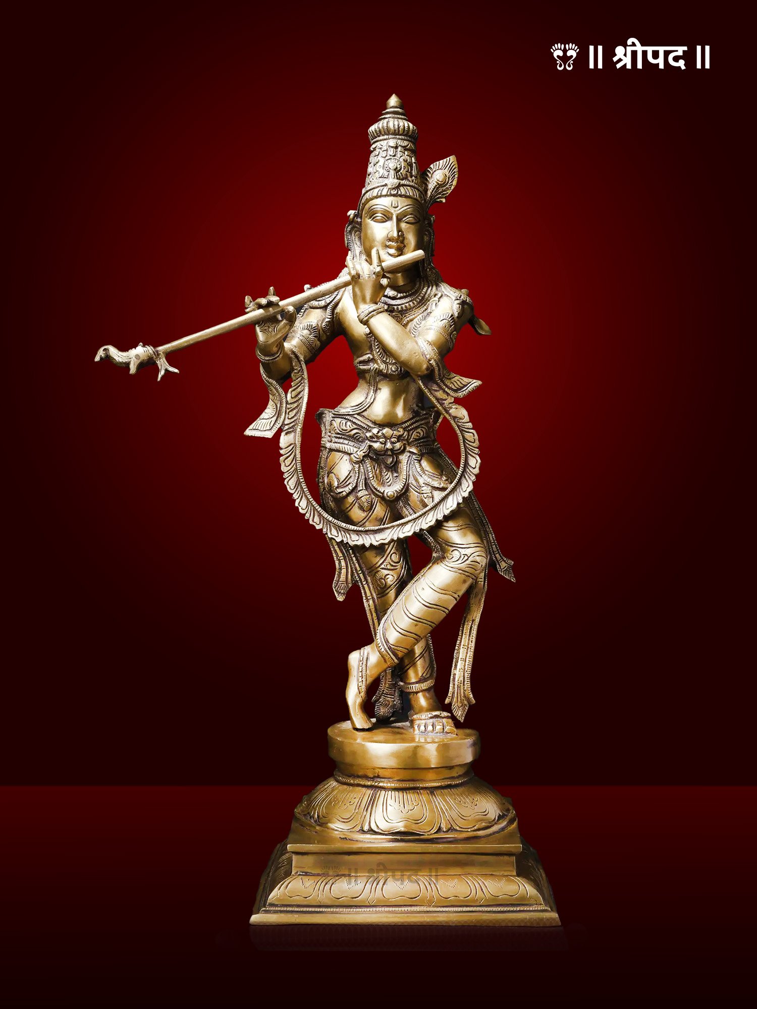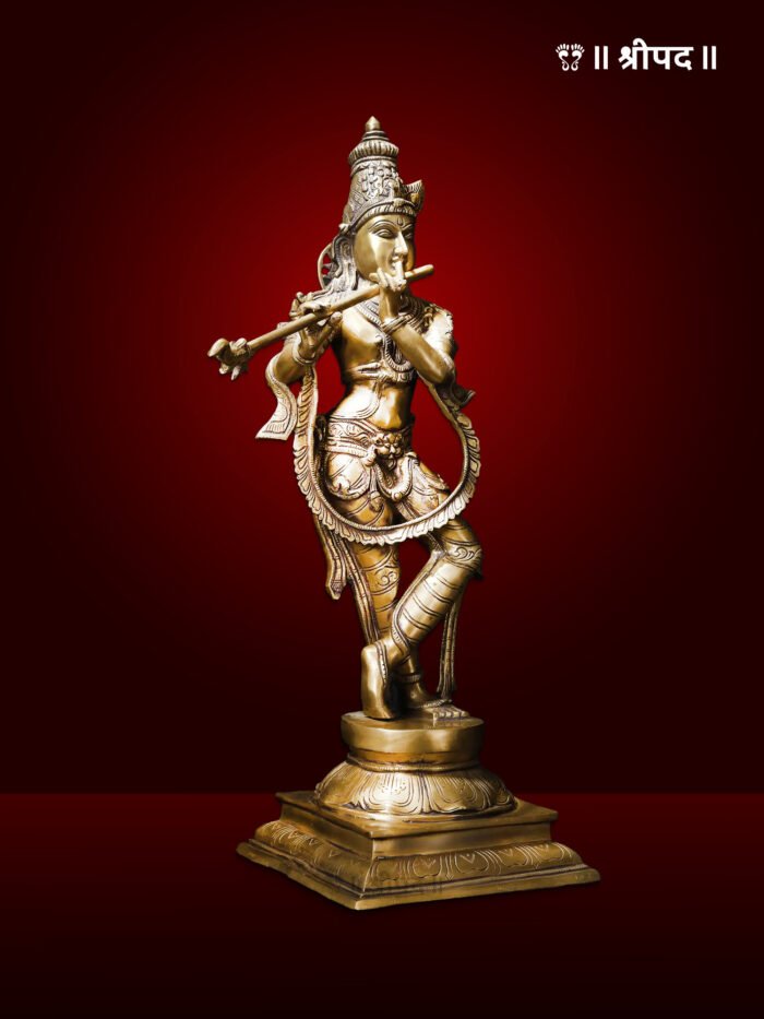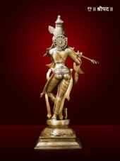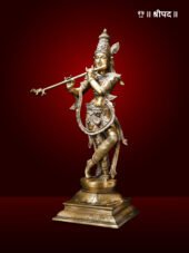 The 28″ Fluting Krishna Brass Statue is a majestic and captivating representation of Lord Krishna, the divine deity of love, music, and universal joy. Crafted from high-quality brass, this statue portrays Krishna in his signature fluting pose, with his flute held to his lips, enchanting all of creation with his melodious music. The fluted posture, known for its graceful curves and fluid movement, is a perfect depiction of Krishna’s charm and the divine love he spreads through his melodies.