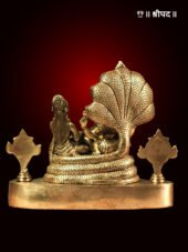 Laxmi Narayan, seated gracefully upon the divine serpent Sheshnaag, symbolizes cosmic balance and eternal protection. This exquisite 10-inch brass idol intricately portrays Lord Vishnu reclining with serene majesty, while Maa Lakshmi, the goddess of wealth and prosperity, sits beside Him, radiating divine grace. Sheshnaag, with its coiled form and seven-hooded canopy, signifies infinite time and cosmic stability.