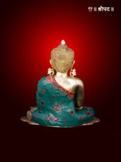The intricate inlay work on the brass statue adds an exceptional level of detail, from the finely carved features of Buddha’s face to the delicate robes and serene expression. The calm demeanor and meditative pose further enhance the statue’s aura of tranquility and enlightenment.