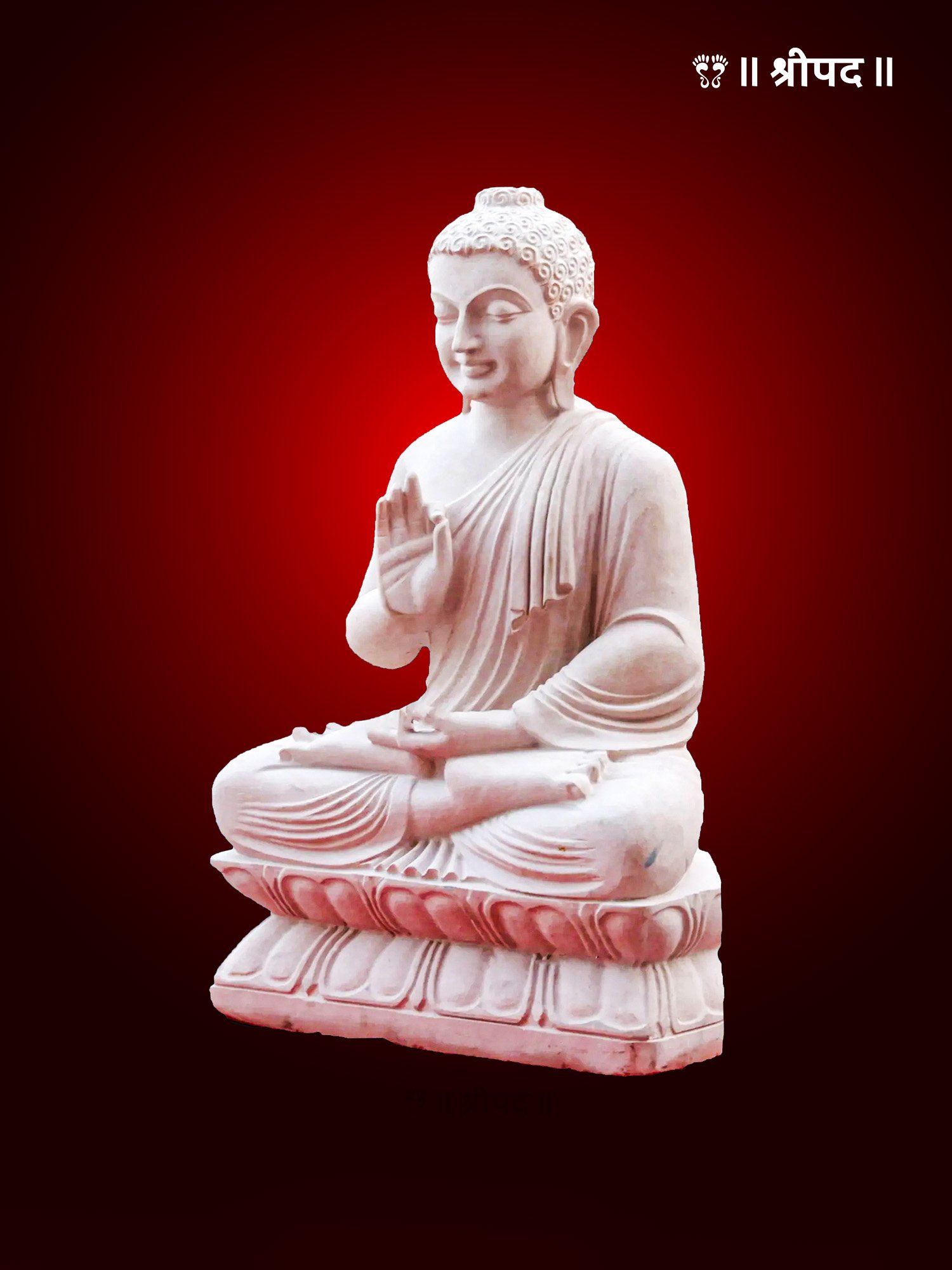 The 30-inch Idol of Lord Buddha with Vitarka Mudra, crafted from fine sandstone, is a striking representation of Buddha in the act of teaching and imparting wisdom. The Vitarka Mudra, with one hand raised and the thumb and index finger forming a circle, symbolizes the turning of the Dharma wheel and the sharing of profound spiritual teachings. The other hand rests in a relaxed position, reflecting inner calm and meditation.
