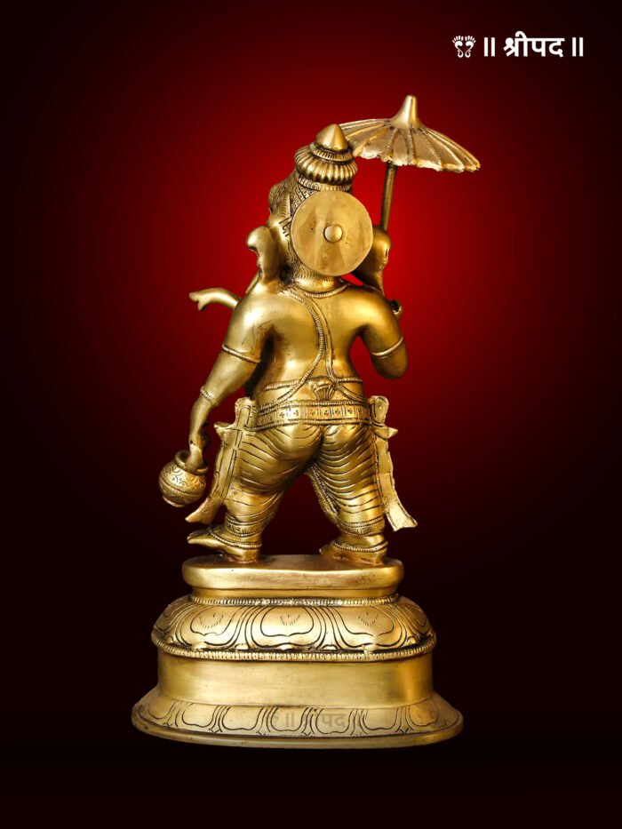 The 14-inch brass statue of Lord Ganesha with an umbrella is a unique and artistic representation of the beloved elephant-headed deity, symbolizing wisdom, prosperity, and the removal of obstacles. In this depiction, Lord Ganesha is gracefully seated, with one hand holding an umbrella, which adds a rare and protective element to his traditional form. The umbrella symbolizes shielding from life’s challenges, bringing divine blessings of security and good fortune.