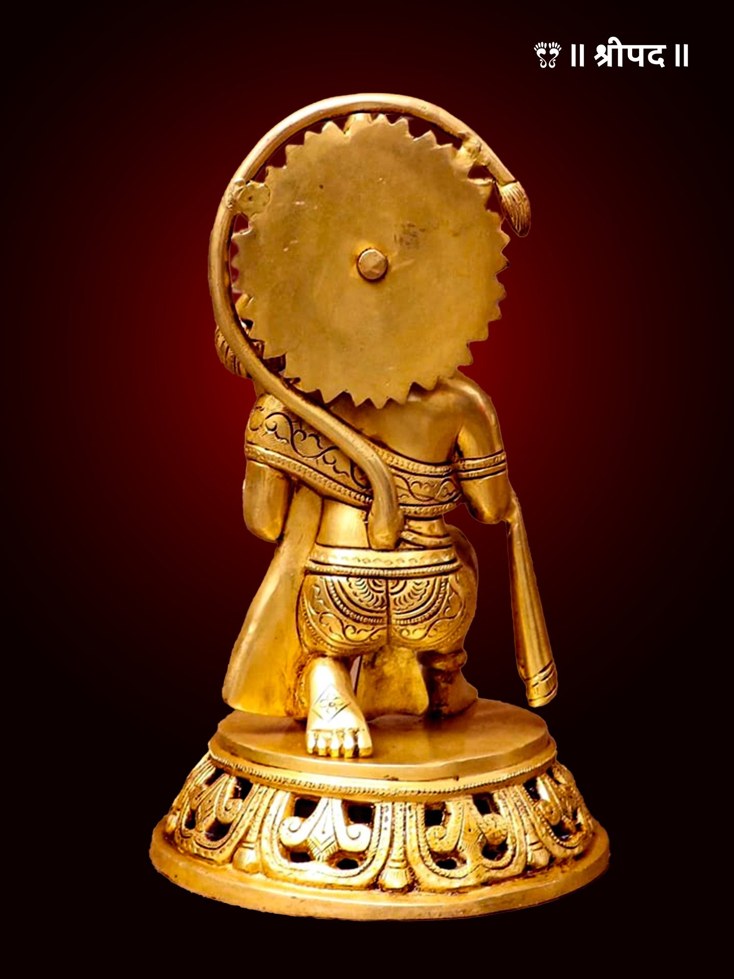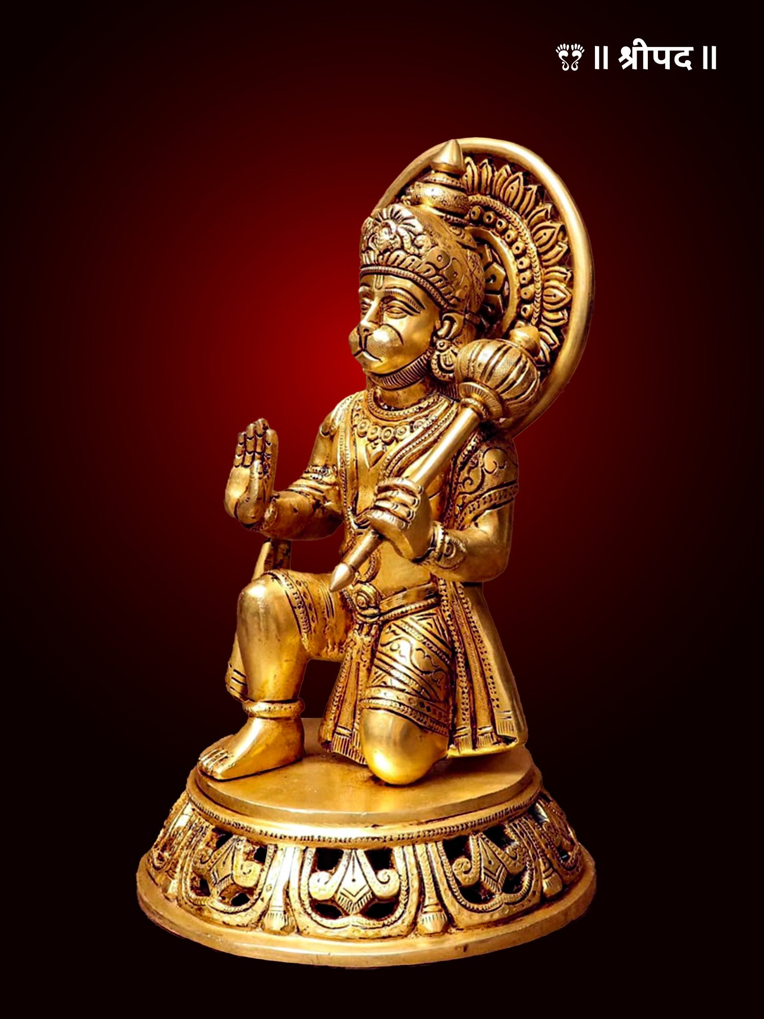 The 11-inch brass statue of Lord Hanuman in a sitting posture with a blessing hand radiates serenity, devotion, and divine grace. Hanuman, revered as the epitome of unwavering devotion, strength, and humility, is depicted here in a tranquil seated pose, exuding calmness and reassurance. His raised hand in the blessing gesture (abhaya mudra) symbolizes protection, courage, and the removal of fears, making this idol a beacon of spiritual solace for devotees.