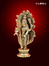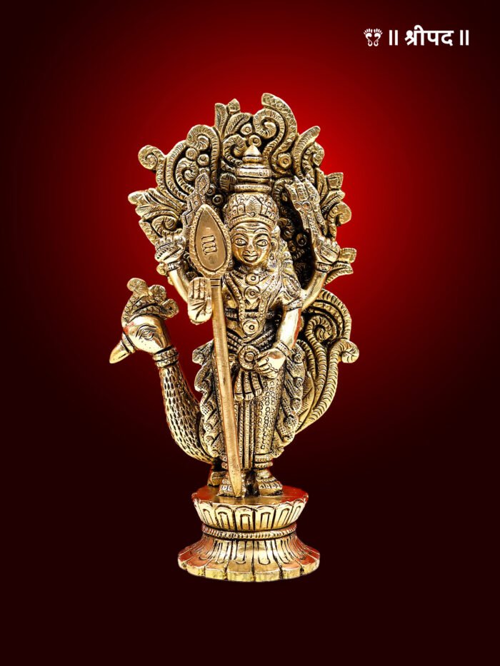 The 6-inch brass statue of Lord Karttikeya, the warrior son of Lord Shiva, is a powerful and intricate representation of bravery, strength, and divine protection. Lord Karttikeya, also known as Murugan, is depicted as a youthful and valiant warrior holding his iconic spear, or vel, which symbolizes his ability to protect dharma and destroy evil forces. His fierce and determined expression conveys his role as a protector of the divine and a warrior who upholds righteousness.