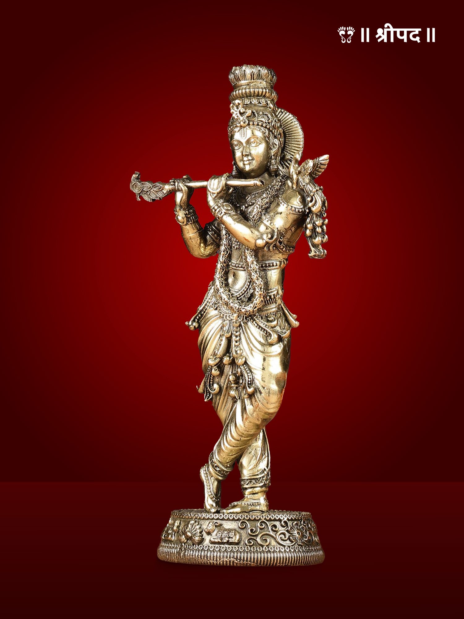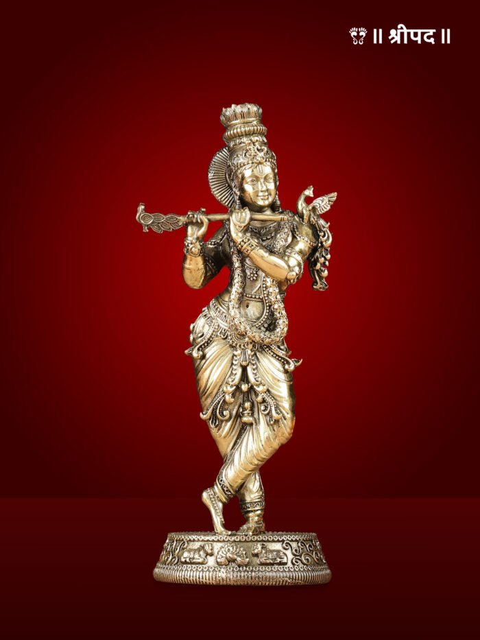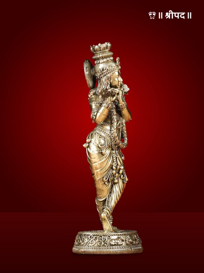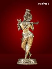 This exquisite pure brass Lord Krishna statue, standing at 6.5 inches, is a captivating embodiment of grace and divinity. Showcasing Lord Krishna in his iconic pose playing the flute, this intricately crafted masterpiece reflects the serenity and charm of the beloved deity. Every detail, from the delicate expressions on Krishna’s face to the ornate carvings on his attire and ornaments, has been meticulously designed by skilled artisans.