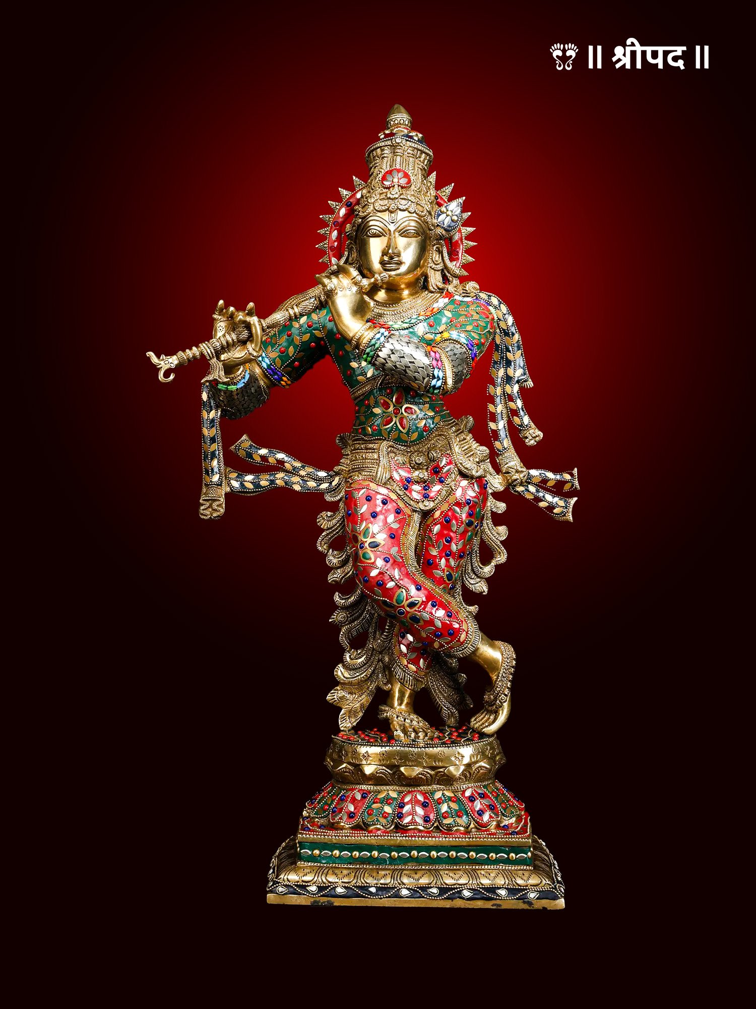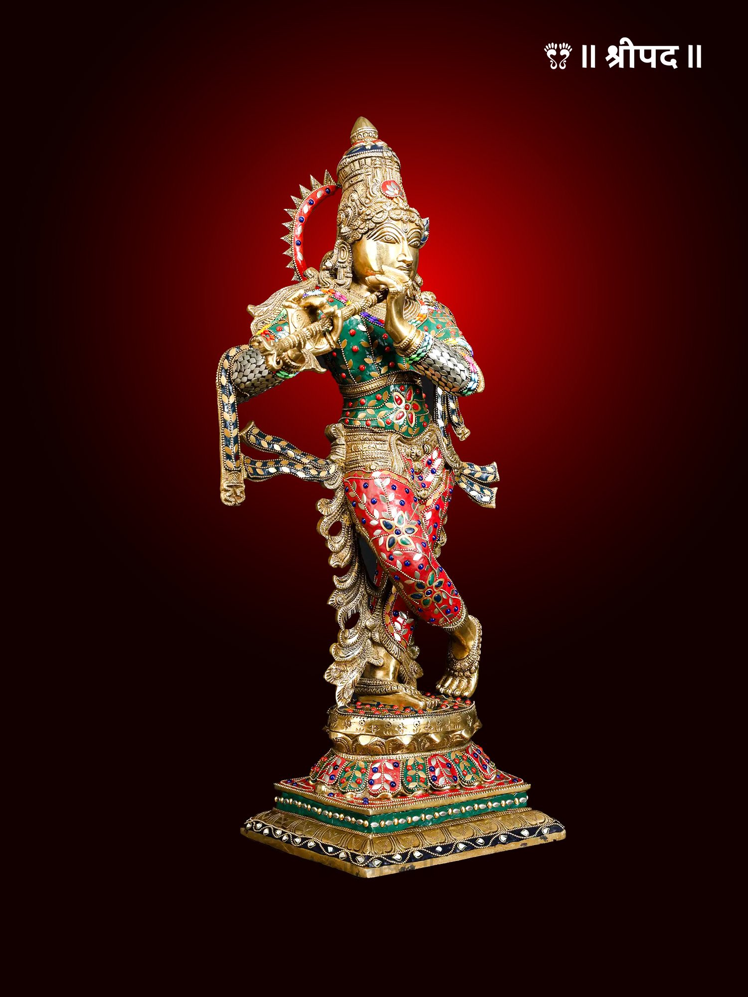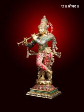 The 26-inch superfine brass statue of Lord Krishna playing the flute is a magnificent piece of art that embodies divine grace and unparalleled craftsmanship. Depicting the Lord in his iconic tribhanga posture, the statue captures the essence of Krishna’s charm and his role as the celestial musician who enchants the universe with his melodious tunes. The intricate inlay work enhances the statue’s elegance, featuring vibrant hues and ornate patterns that accentuate its visual appeal.