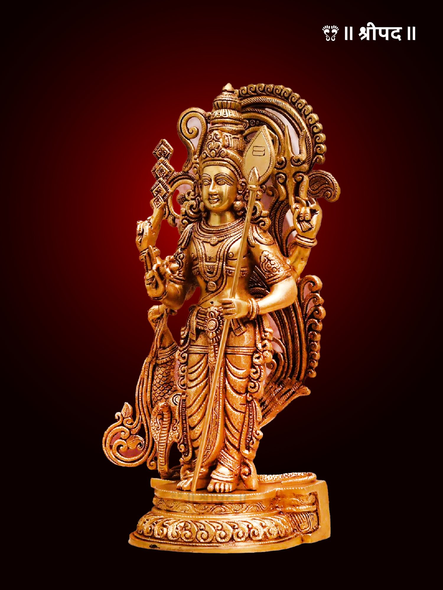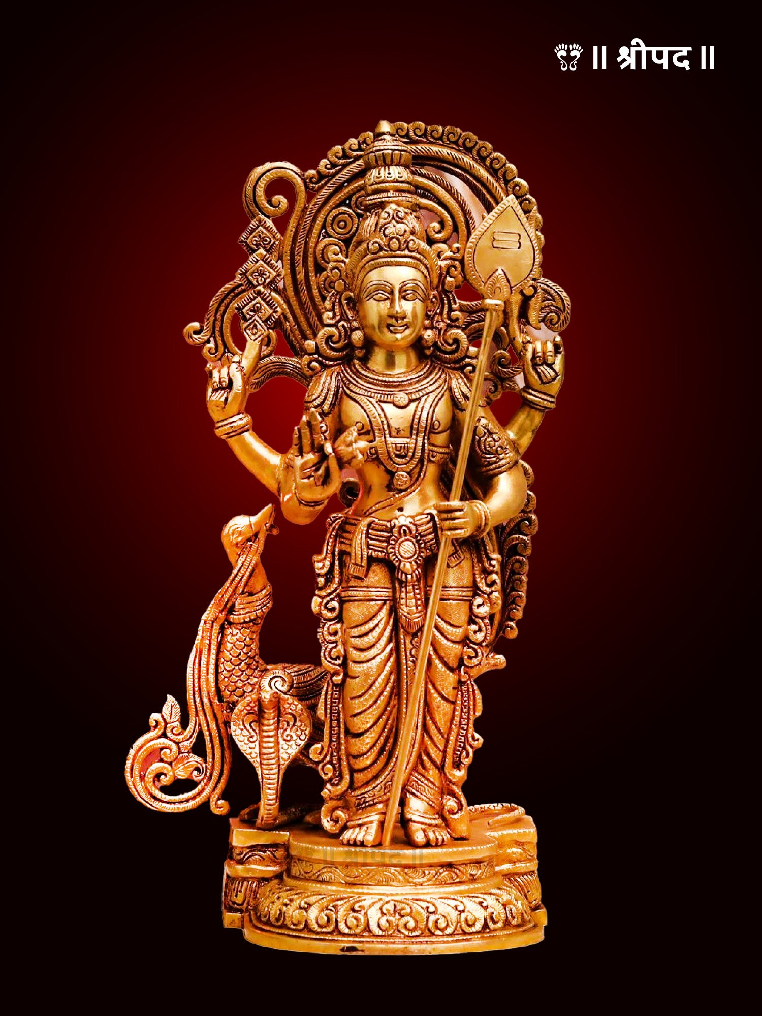 The 20-inch brass idol of Lord Murugan, also known as Kartikeya, is a splendid embodiment of divine grace, power, and traditional artistry. Lord Murugan is depicted in a majestic stance, holding his iconic vel (spear), a symbol of spiritual wisdom and the victory of good over evil. His serene yet commanding presence reflects his role as the celestial warrior and protector of dharma.