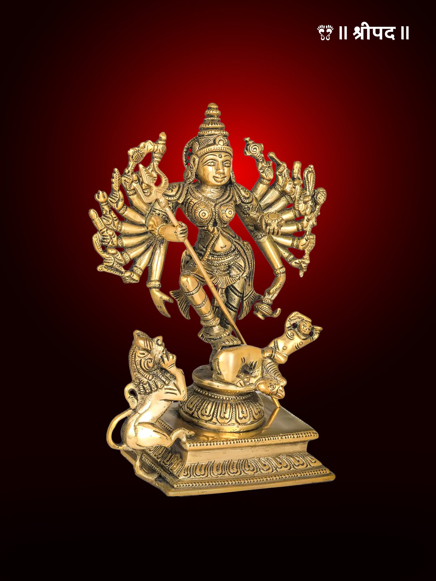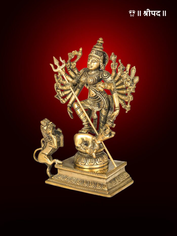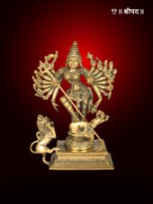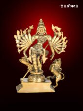 The 8-inch Mahishasur Mardini brass statue is a stunning handmade depiction of Goddess Durga in her most powerful form, symbolizing the triumph of good over evil. This intricately crafted statue portrays the goddess slaying the demon Mahishasura, a testament to her invincible strength, divine justice, and protective nature.