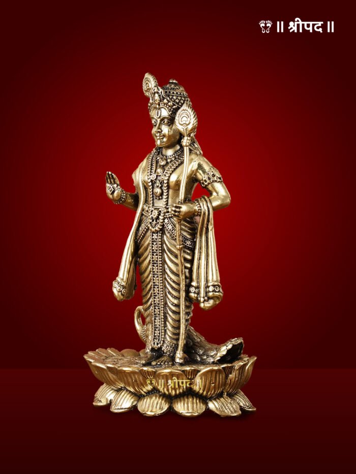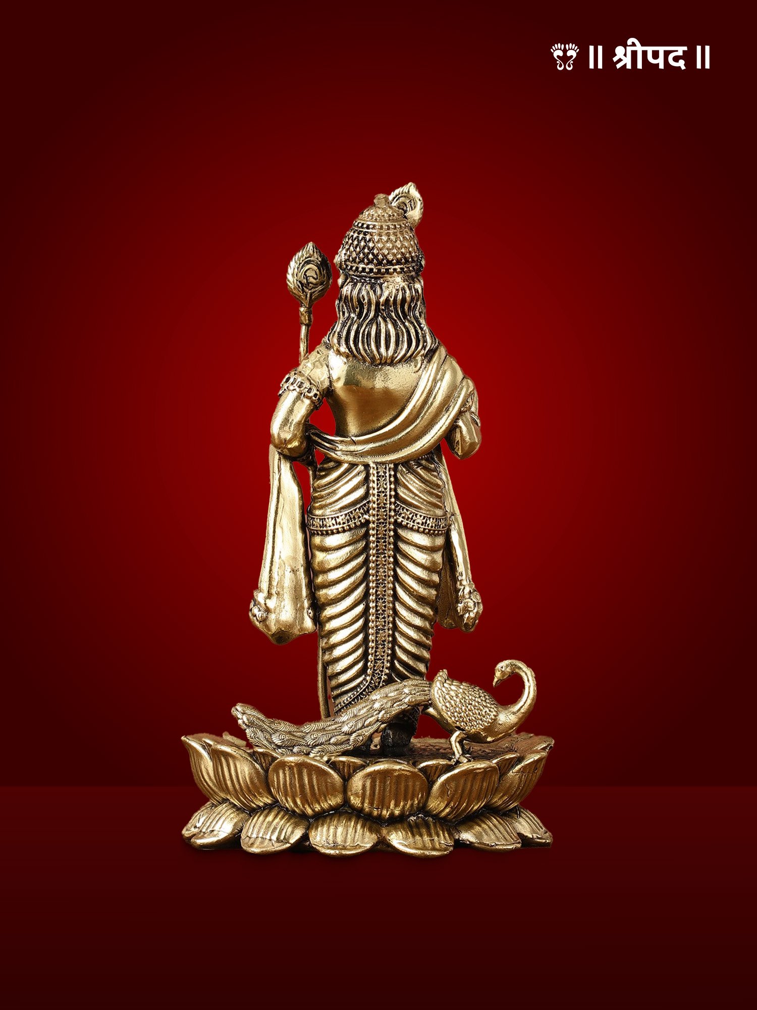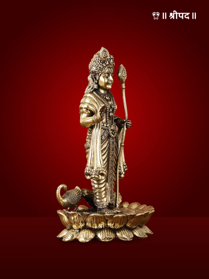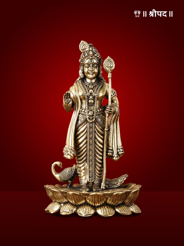 The exceptional craftsmanship is evident in the finely carved features of Lord Murugan, his intricate attire, and the elegant portrayal of the peacock, which adds to the overall spiritual and artistic appeal. The polished brass finish enhances its timeless elegance, making it a perfect addition to home temples, meditation spaces, or altars.