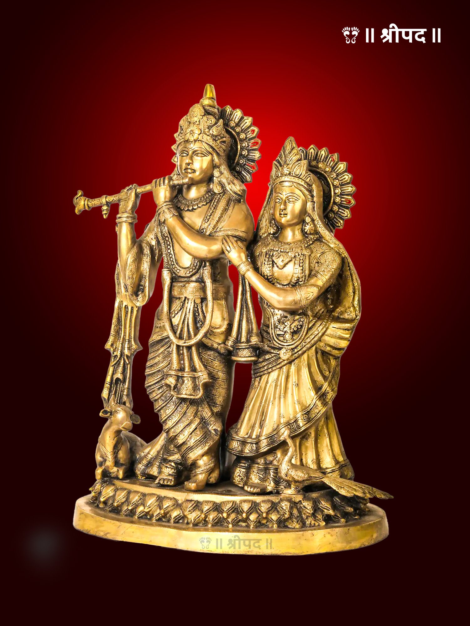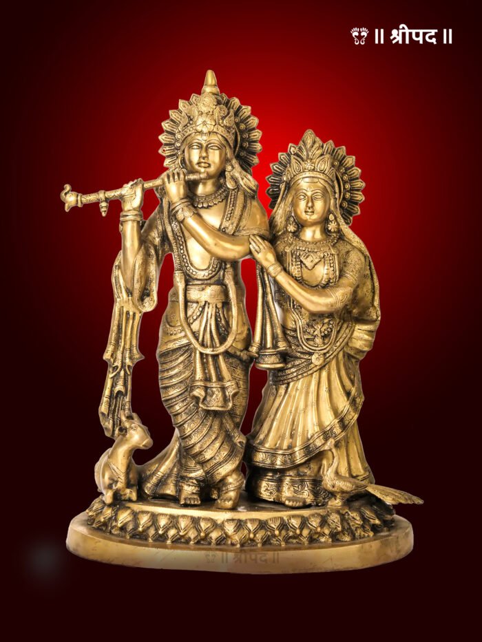 The 22-inch divine pair of Radha Krishna brass statue, featuring the beloved deities along with a cow and peacock, is a magnificent and spiritually rich representation of divine love, beauty, and harmony. Lord Krishna, with his enchanting flute, is depicted in a serene, playful posture, while Goddess Radha, his eternal consort, stands gracefully by his side, symbolizing devotion, love, and the supreme bond between the divine couple.