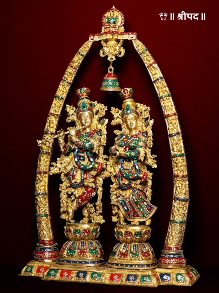 Radha-Krishna Statues Within an Aureole Engraved with Krishnaleela | 45-Inch | Brash with Inlay