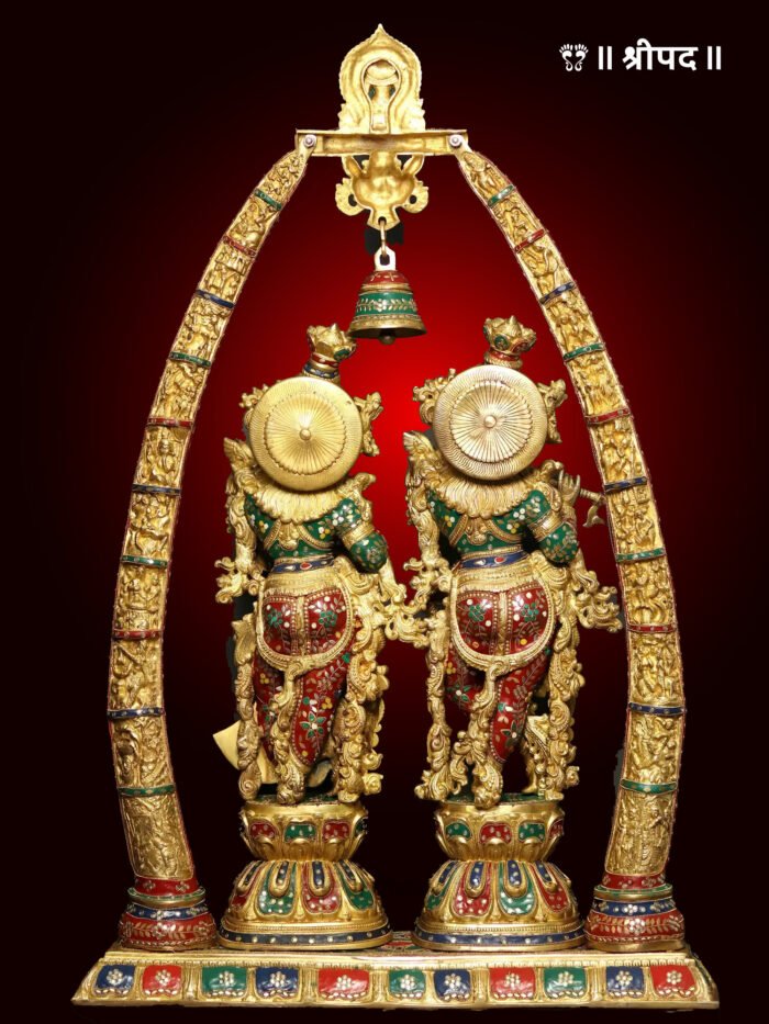 The 45-inch Identical Radha-Krishna Statues Within an Aureole Engraved with Krishnaleela Episode is a breathtaking and divine representation of Lord Krishna and Radha, captured in a majestic and deeply symbolic form. This masterpiece features both deities within a beautifully engraved aureole, symbolizing their eternal love and divine union. The intricately detailed aureole showcases scenes from the Krishnaleela—the episodes from Krishna’s divine play with his devotees, which are sacred and full of symbolism.