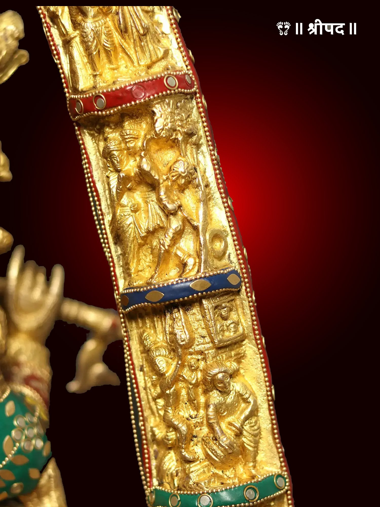 Lord Krishna is depicted with his iconic flute, while Radha, in her graceful form, stands beside him, exuding divine love and devotion. The high level of craftsmanship is evident in the finely detailed features, vibrant attire, and ornate jewelry of both deities. The engraved scenes within the aureole bring to life the spiritual and enchanting tales of Krishna’s life, creating a profound visual experience.