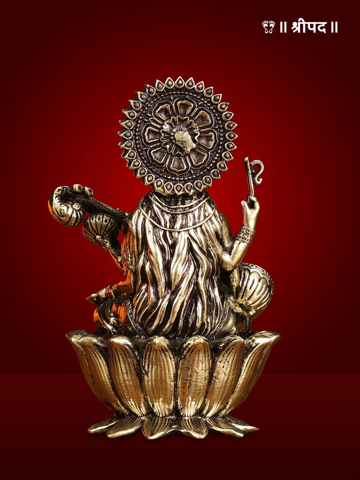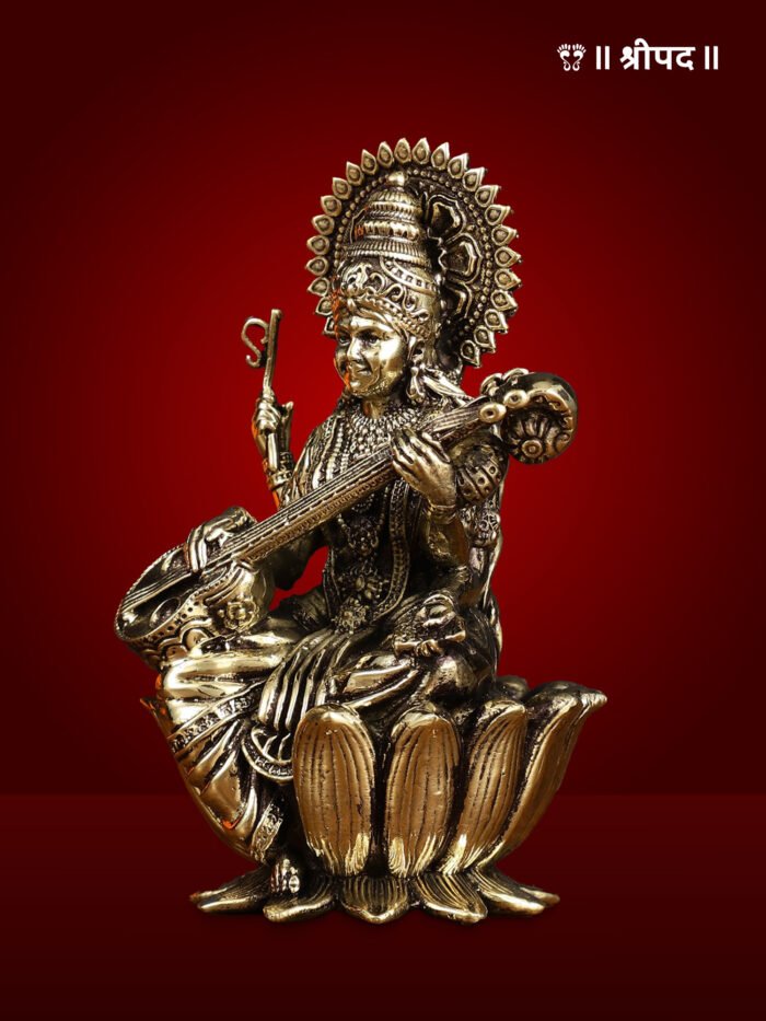 Goddess Saraswati is intricately detailed, holding her veena, a symbol of harmony and creativity, along with sacred texts, signifying the pursuit of knowledge. The flowing drapery, adorned jewelry, and delicate carvings reflect masterful artistry, while the polished brass finish enhances its timeless beauty.