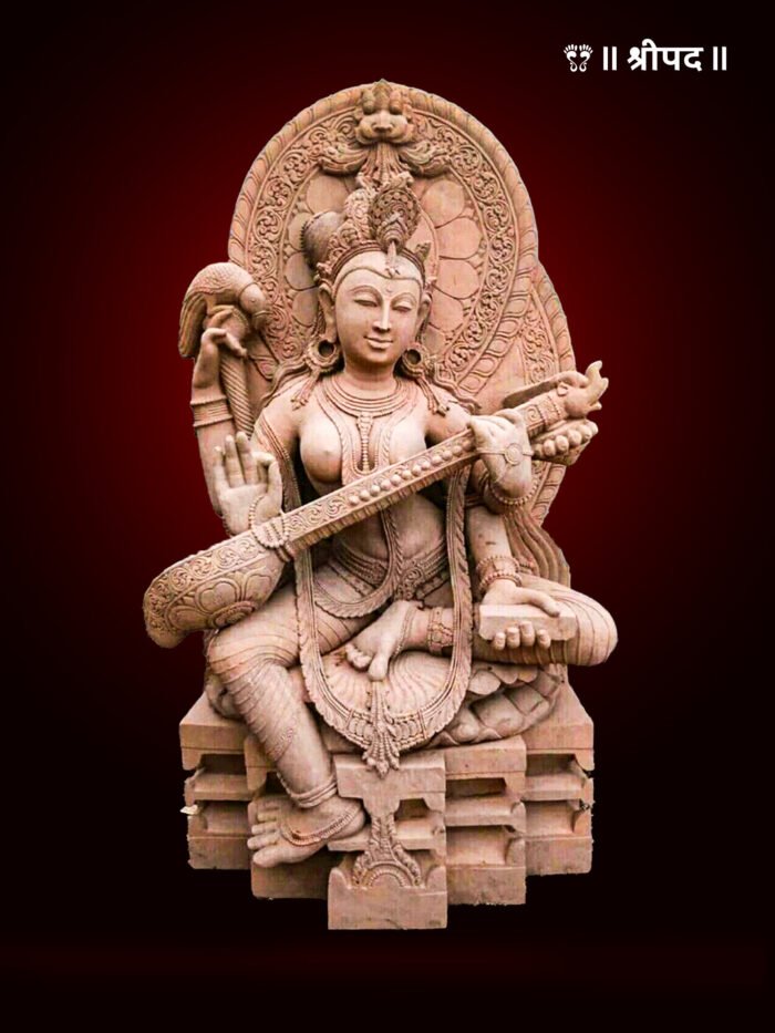 The natural sandstone texture enhances the idol’s timeless appeal, lending an earthy charm that resonates with spiritual purity. Standing tall at 60 inches, this exquisite murti serves as a stunning focal point for homes, temples, or educational institutions, radiating blessings of wisdom, enlightenment, and creativity.