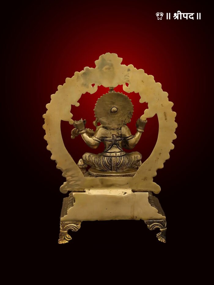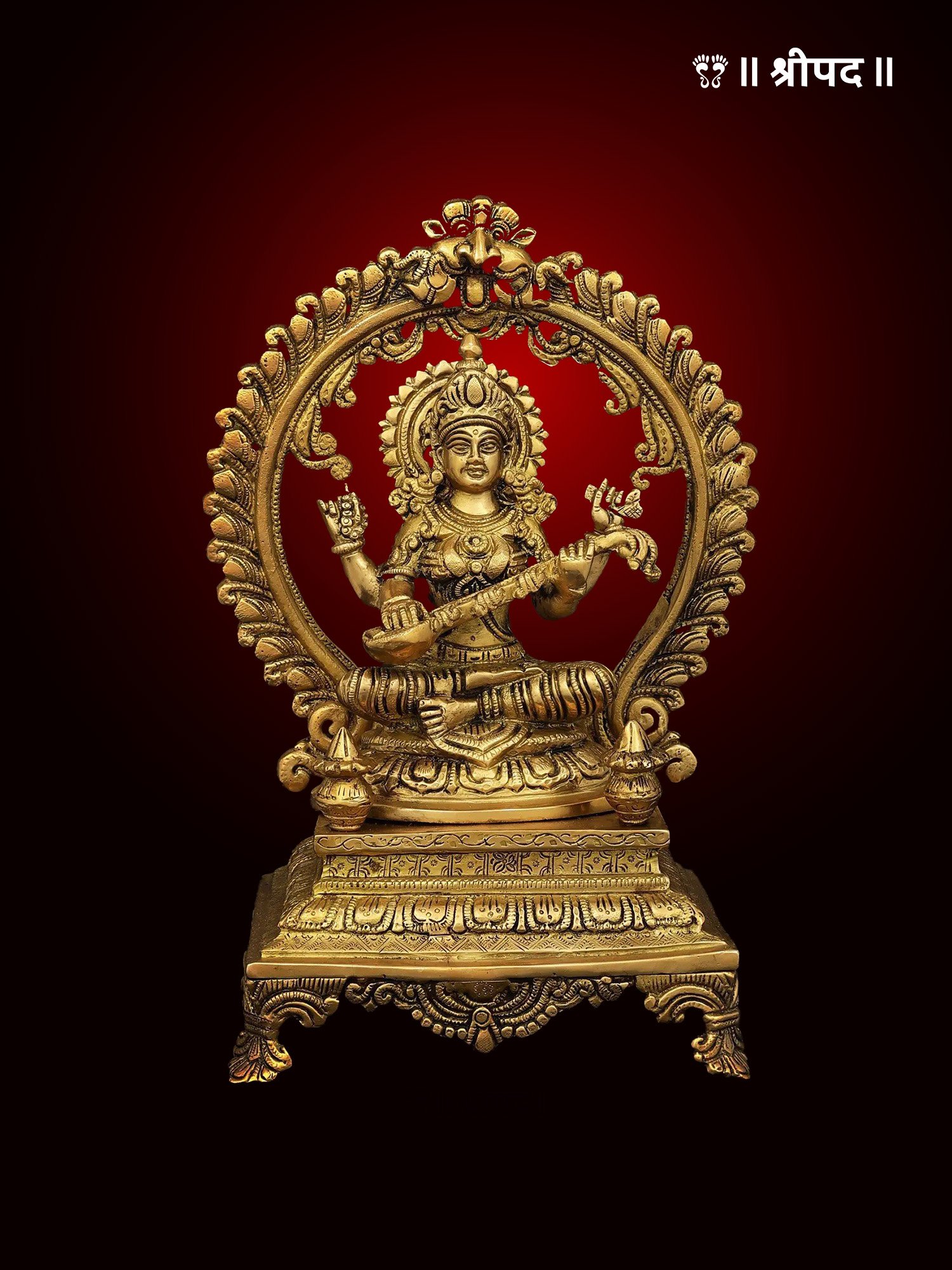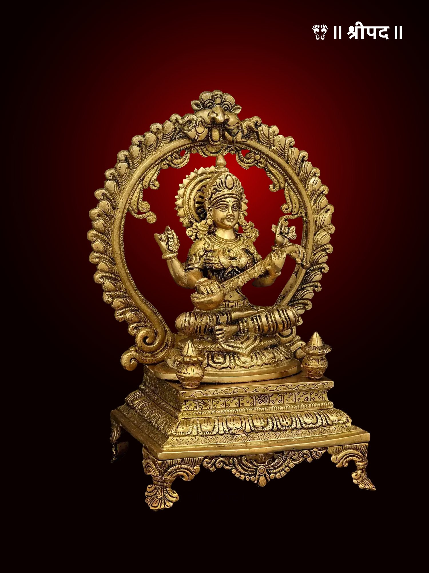Crafted from high-quality brass, the statue features intricate detailing, from the fine carvings on her attire and jewelry to the delicate plinth that elevates the idol. The elegant design of the statue reflects traditional craftsmanship, capturing the goddess’s divine grace and wisdom. The high plinth enhances the statue’s regal presence, making it a striking centerpiece in any space.