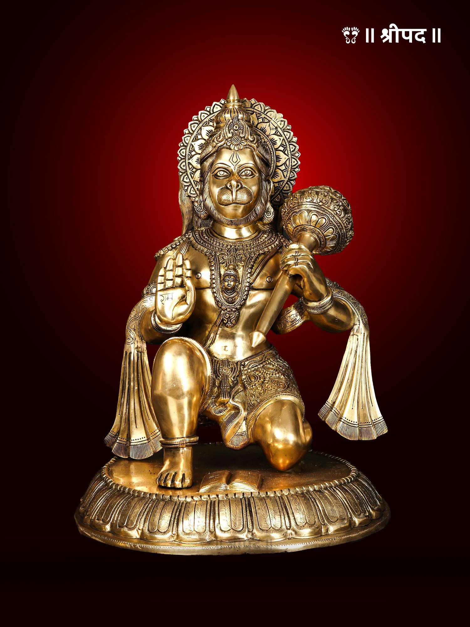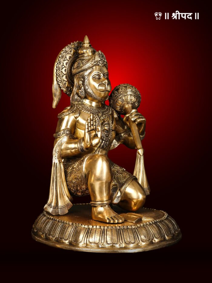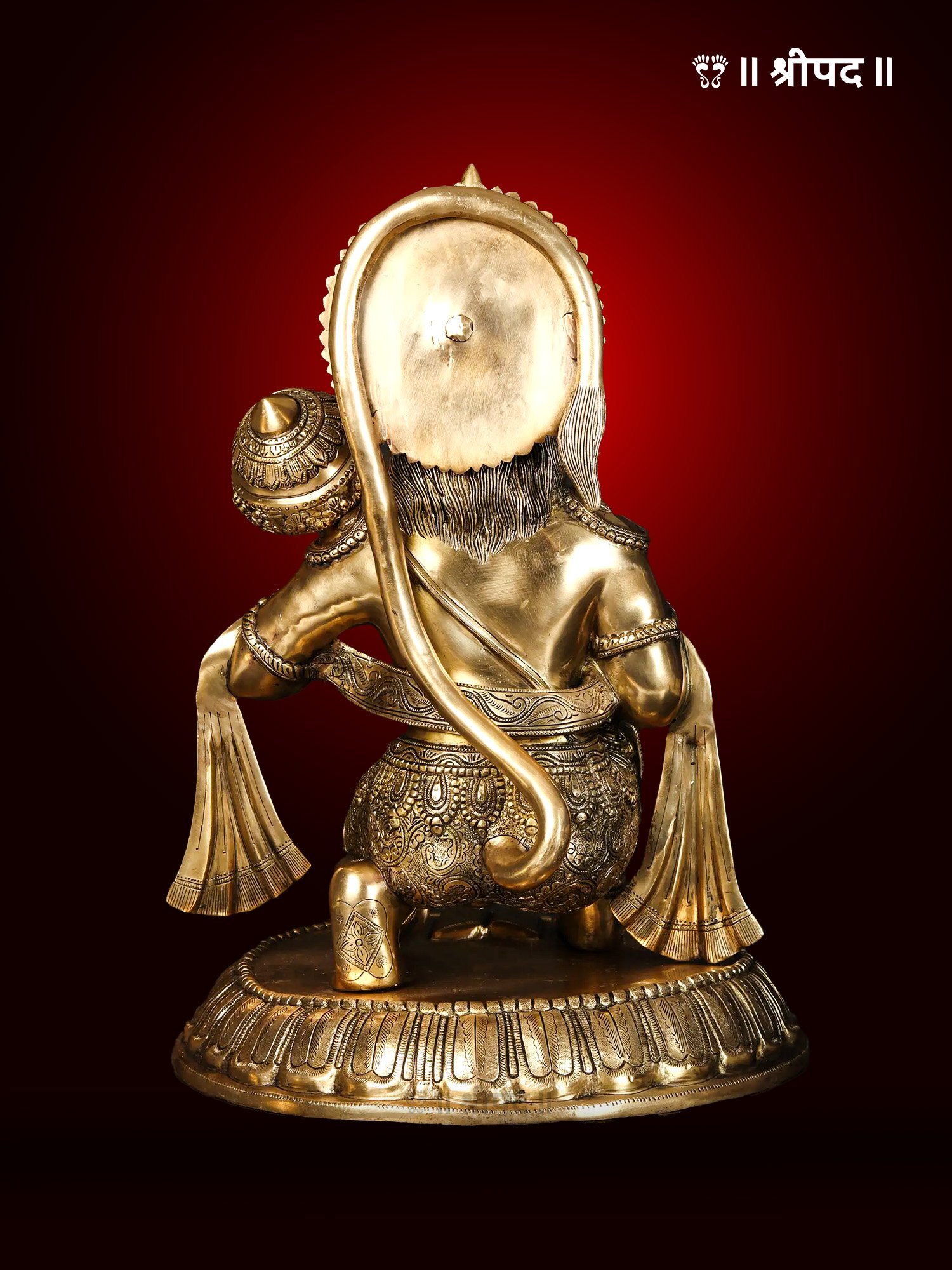 The 21-inch brass statue of Lord Hanuman seated in a blessing gesture is a majestic and powerful representation of the deity, symbolizing strength, devotion, and protection. Lord Hanuman is depicted seated in a calm, meditative posture, with one hand raised in the Abhaya Mudra, offering blessings and fearlessness to his devotees. His other hand holds a mace (gada), representing his immense strength and his role as a protector.