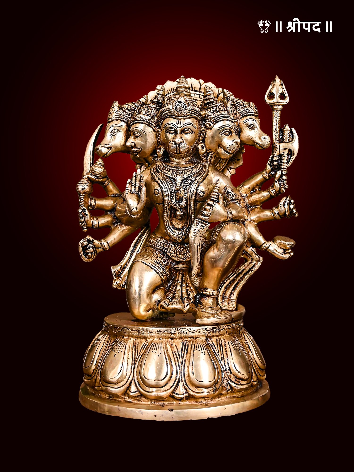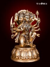 This magnificent 12-inch brass idol of Panchmukhi Hanuman showcases the divine protector in a seated, blessing posture, exuding power, devotion, and protection. Panchmukhi Hanuman, the five-faced incarnation of Lord Hanuman, represents his multifaceted divine abilities—Hanuman (East, strength and courage), Narasimha (South, protection from fear), Garuda (West, freedom from negativity), Varaha (North, stability and prosperity), and Hayagriva (Sky, wisdom and knowledge).