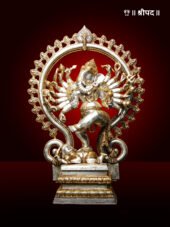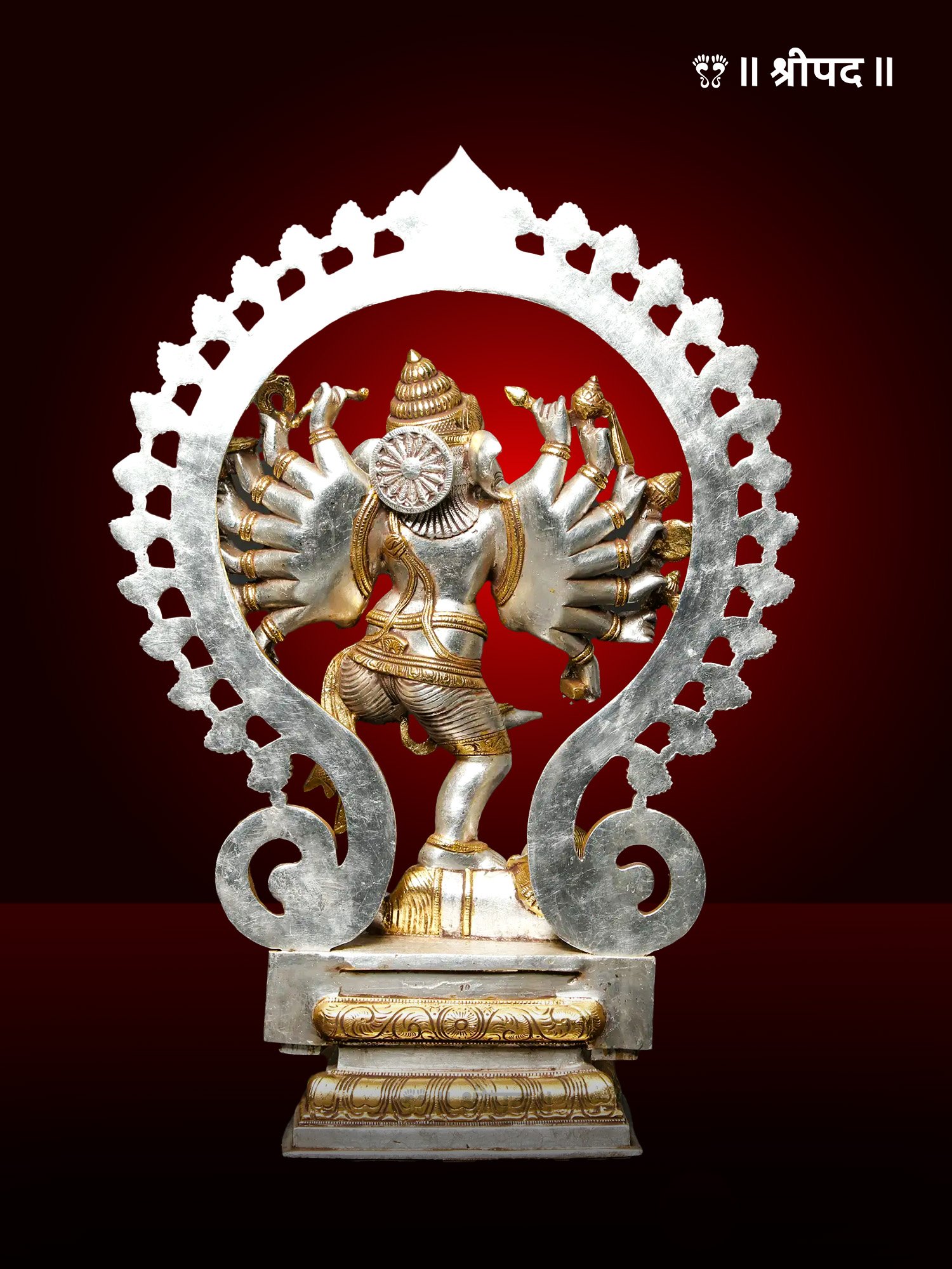 The 26-inch Gold and Silver Sixteen-Armed Dancing Lord Ganesha Brass Statue is a magnificent representation of Lord Ganesha in a dynamic and exuberant form, embodying divine energy, creativity, and wisdom. This handcrafted masterpiece showcases Ganesha with sixteen arms, each holding symbolic objects that reflect his supreme powers and multifaceted nature.