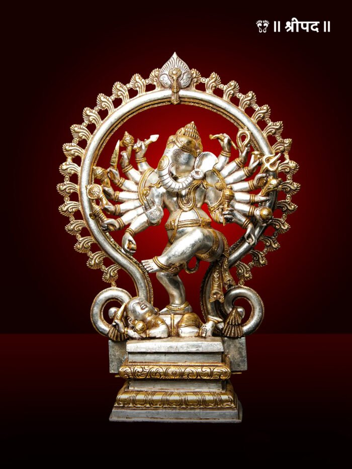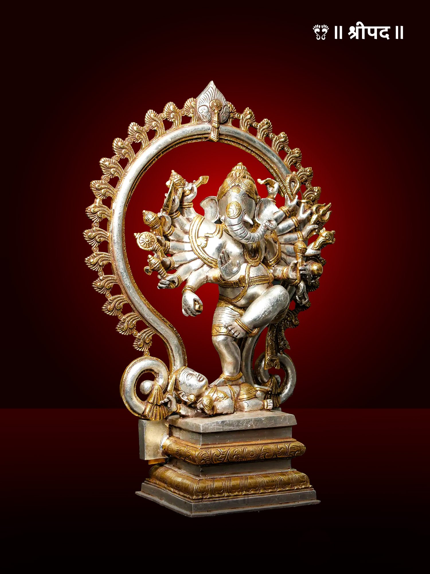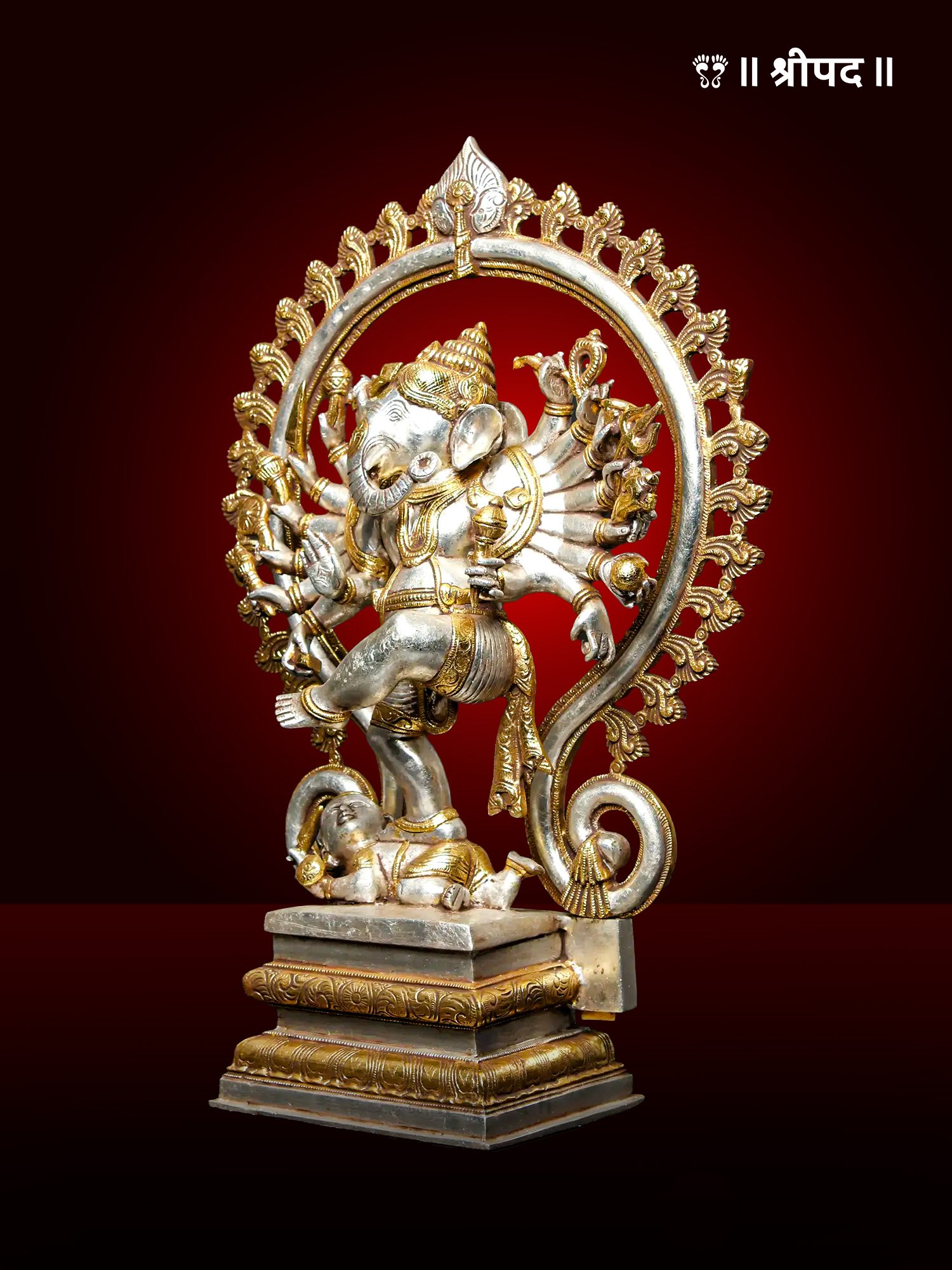 Rendered in a harmonious blend of gold and silver finishes, the statue captures the vibrant essence of Lord Ganesha’s dance, symbolizing cosmic rhythm and the removal of obstacles. His intricate ornaments, flowing attire, and serene yet powerful expression are beautifully detailed, demonstrating the craftsmanship of skilled Indian artisans.
