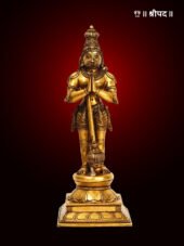 The Standing Hanuman with Namaste Idol is a divine representation of Bhakta Hanuman, crafted in 16-inch brass with intricate detailing. This exquisite idol depicts Anjaneya in a reverent posture, hands folded in Namaste, symbolizing devotion, humility, and unwavering faith. The polished brass finish enhances its spiritual aura, making it ideal for puja rooms, temples, and sacred spaces.