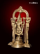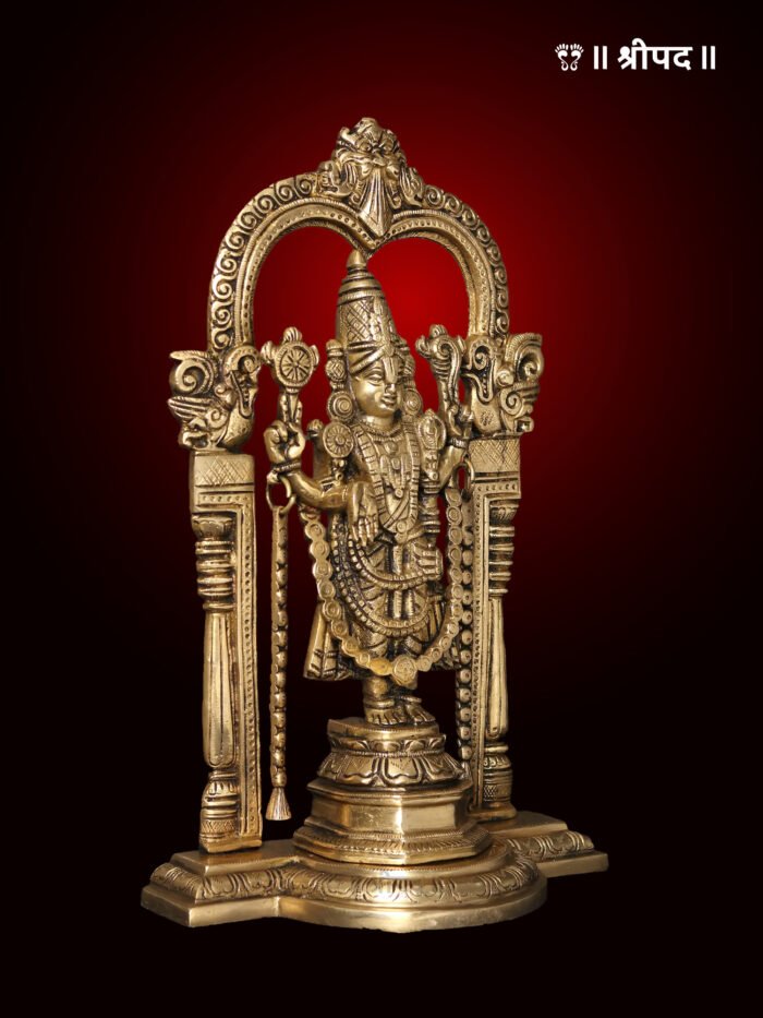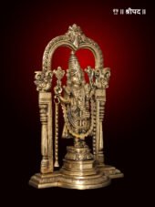 The 13-inch brass statue of Lord Tirupati Balaji (Venkateshvara) standing gracefully beneath a Kirtimukha arch is a divine and majestic representation of the revered deity. Lord Venkateshvara, known for his supreme power and benevolence, is depicted in a standing posture, symbolizing his divine protection and blessings. His serene expression and regal attire radiate spiritual grace, while his right hand is raised in a blessing gesture, offering solace and prosperity to his devotees.