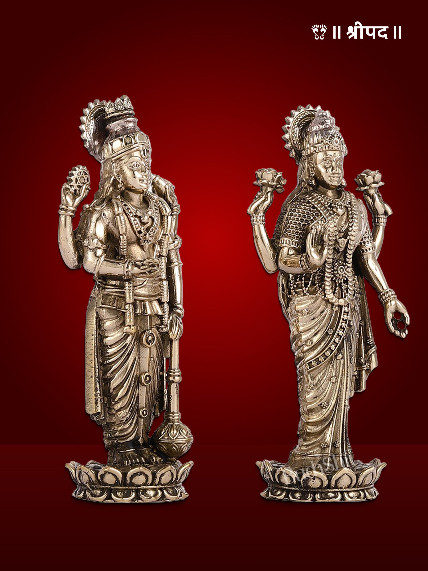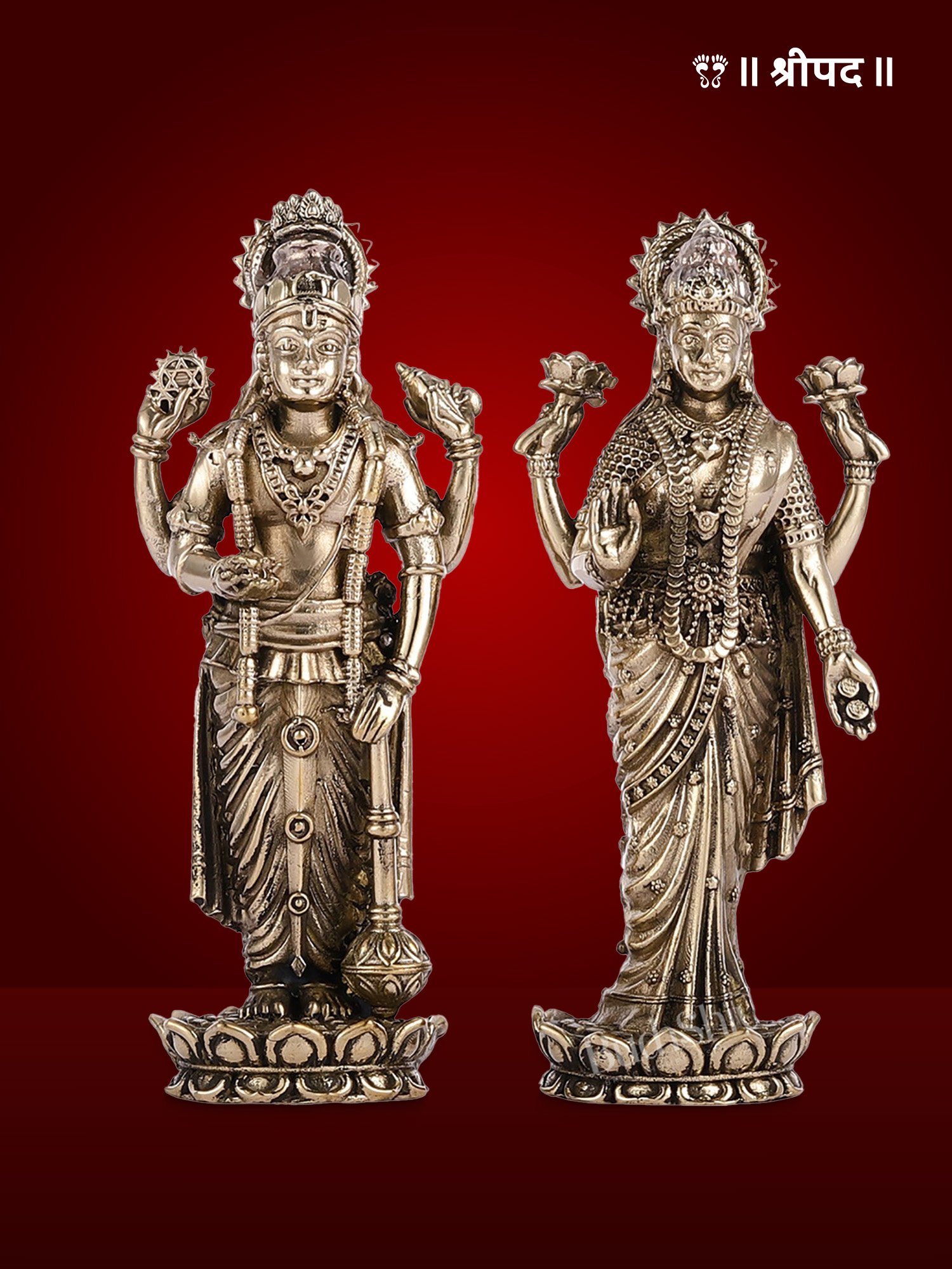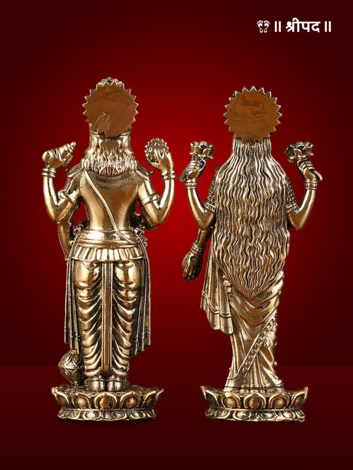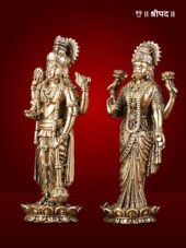 Crafted from premium-grade brass, the statue showcases intricate detailing—from the elegant ornaments and sacred symbols adorning their divine forms to the finely carved lotus base that symbolizes purity and enlightenment. The golden finish enhances its aesthetic appeal, reflecting the skilled craftsmanship and devotion of traditional artisans.