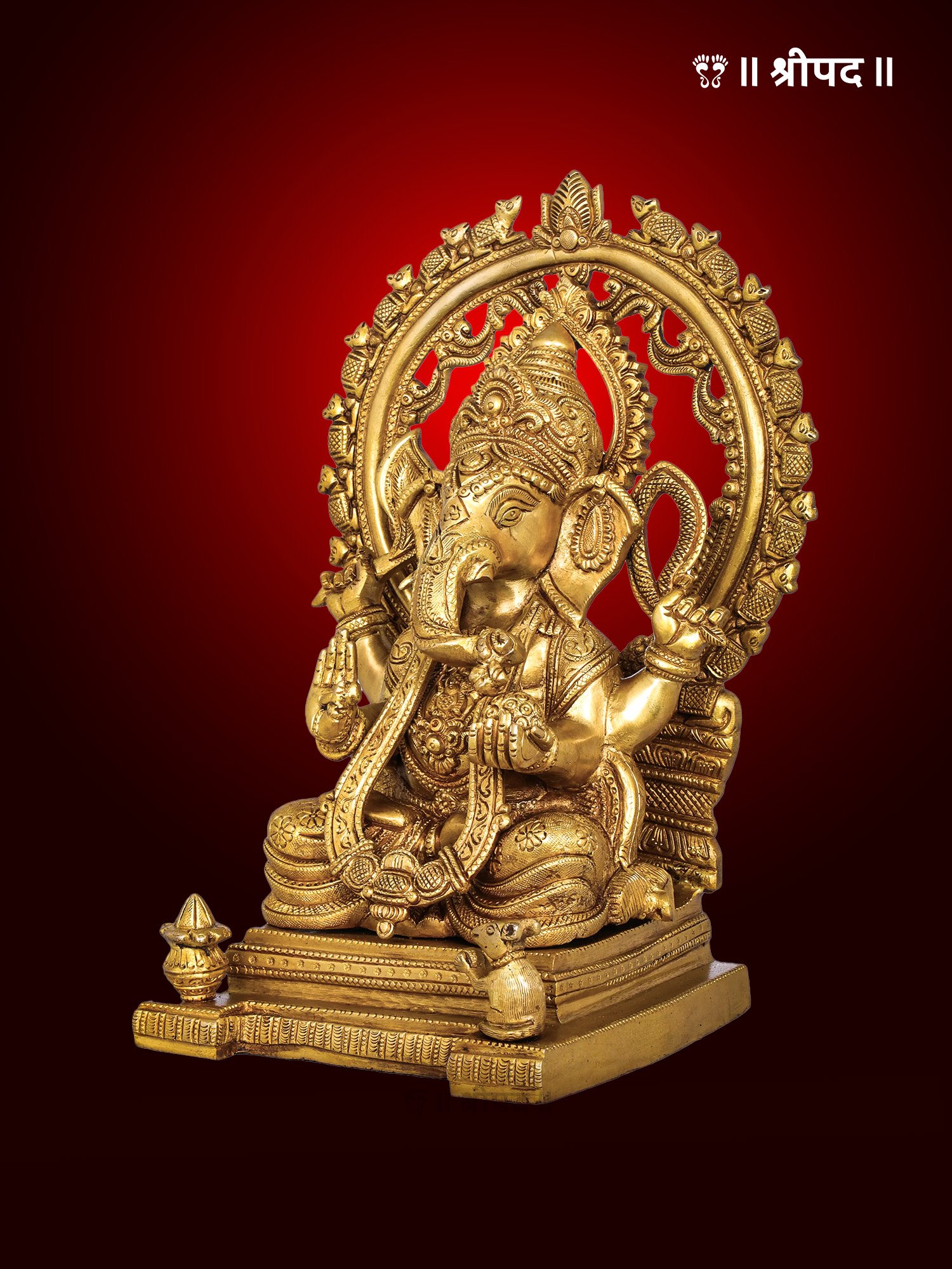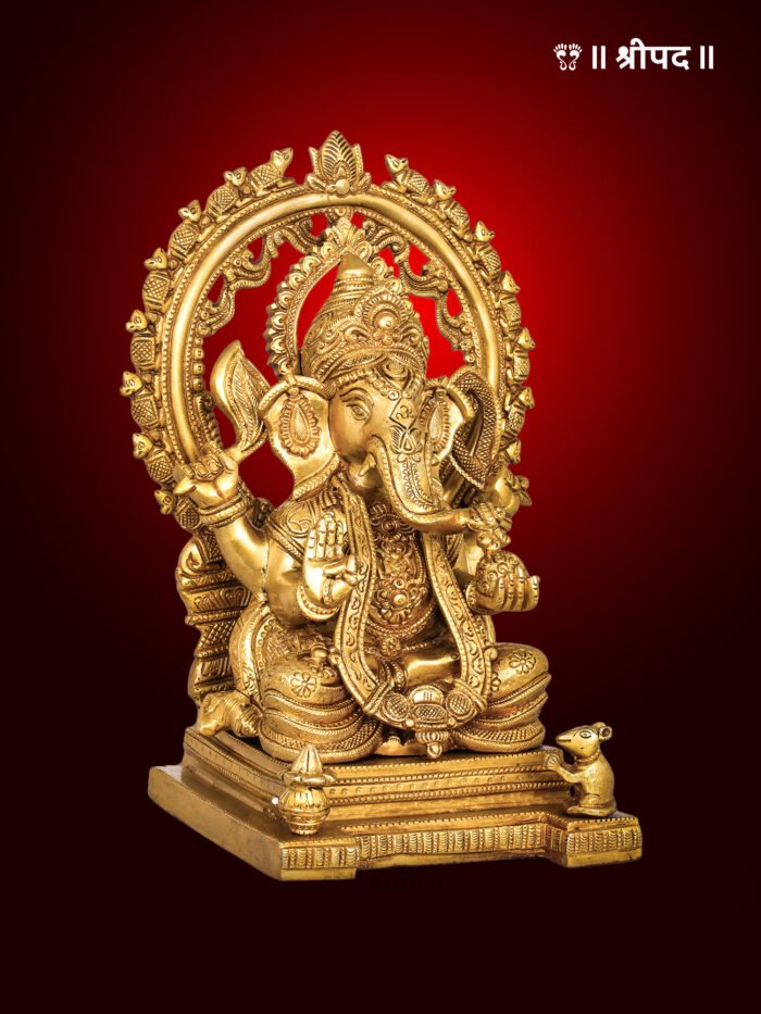 Meticulously handcrafted, this statue showcases exceptional artistry, from the detailed carvings on the throne and Ganesha’s intricate ornaments to the lifelike depiction of the marching rats. The fine brass finish enhances the statue’s elegance, making it a captivating centerpiece.